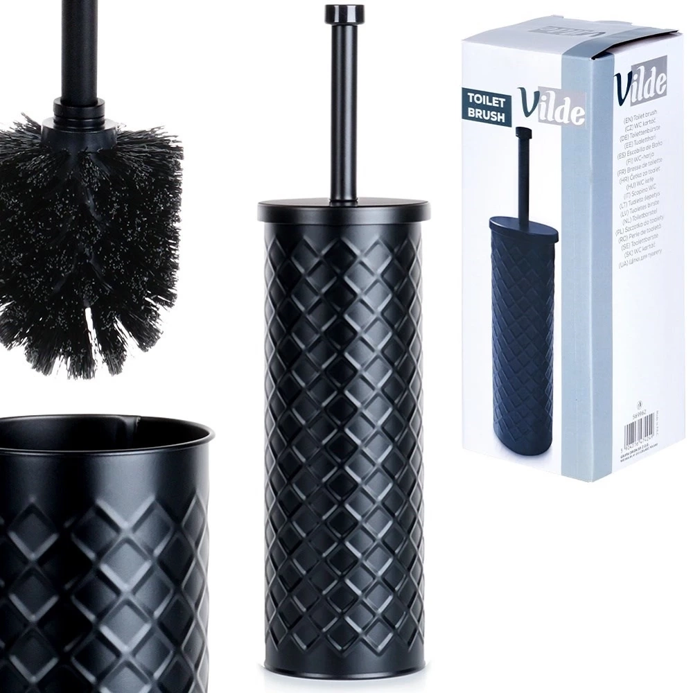 - Szczotka do czyszczenia WC z pojemnikiem. Prosty wzór wkomponuje się w przestrzeń każdej łazienki, czy toalety. Włosie szczotki wykonane z tworzywa w kolorze czarnym.