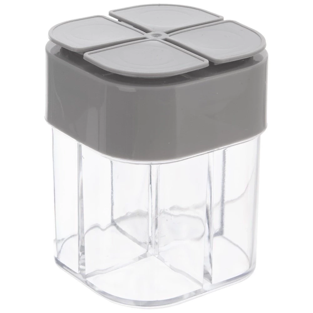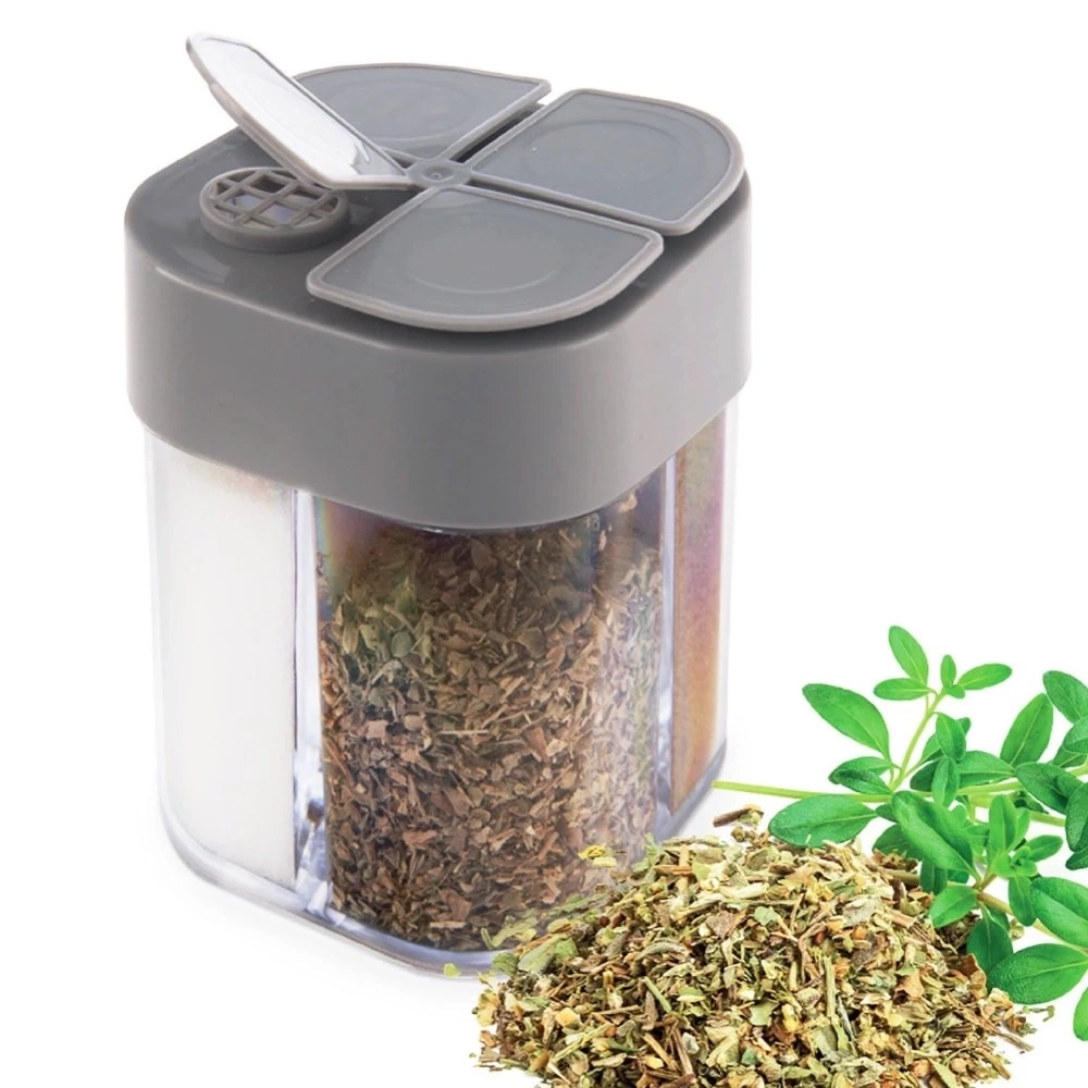 - Niezwykle poręczny pojemnik do dozowania przypraw wraz z naklejkami. Podzielony na 4 części pozwoli na przechowywanie różnych przypraw. Praktyczne zamknięcia.