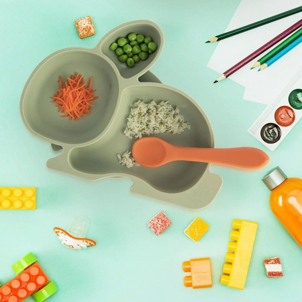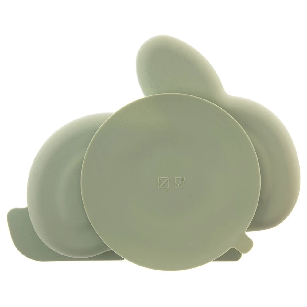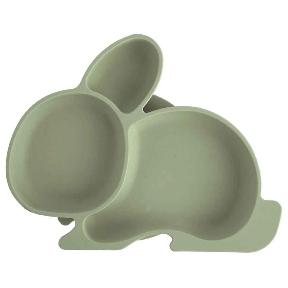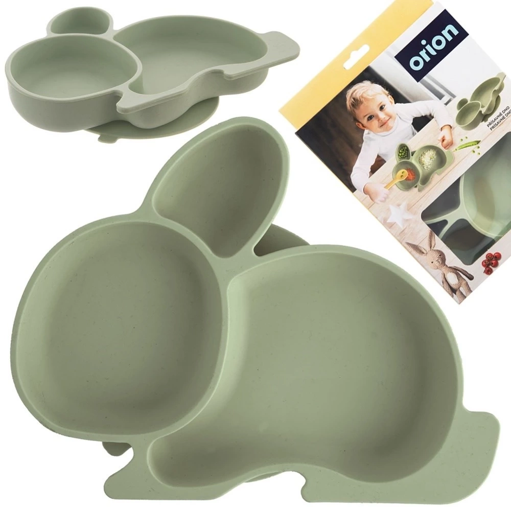 - Talerzyk dziecięcy w kształcie króliczka. Wykonany z silikonu, z mocną przyssawką. Trzy oddzielne przegródki umożliwiają serwowanie różnorodnych posiłków.
