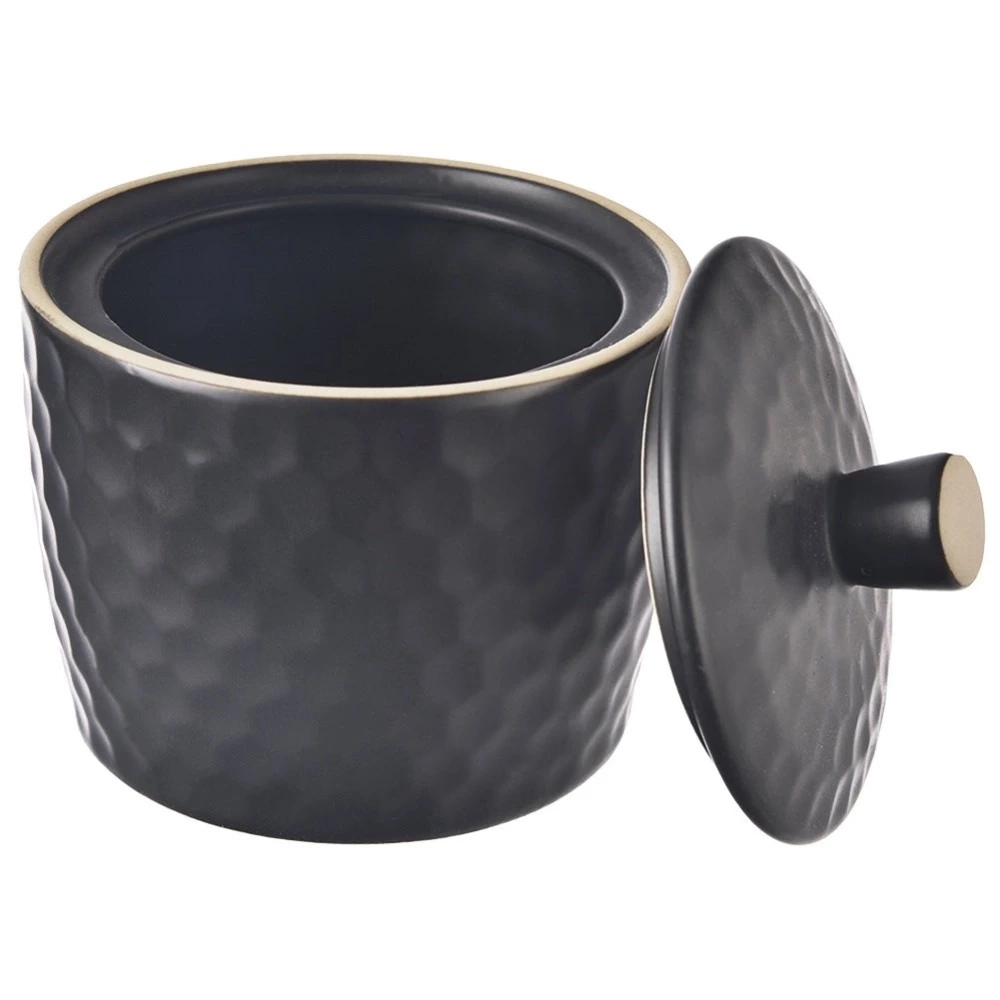 - Cukierniczka z pokrywką o pojemności 320 ml. Wykonana z ceramiki w czarnym kolorze. Posiada nowoczesny design. Nadaje się do zmywarki.