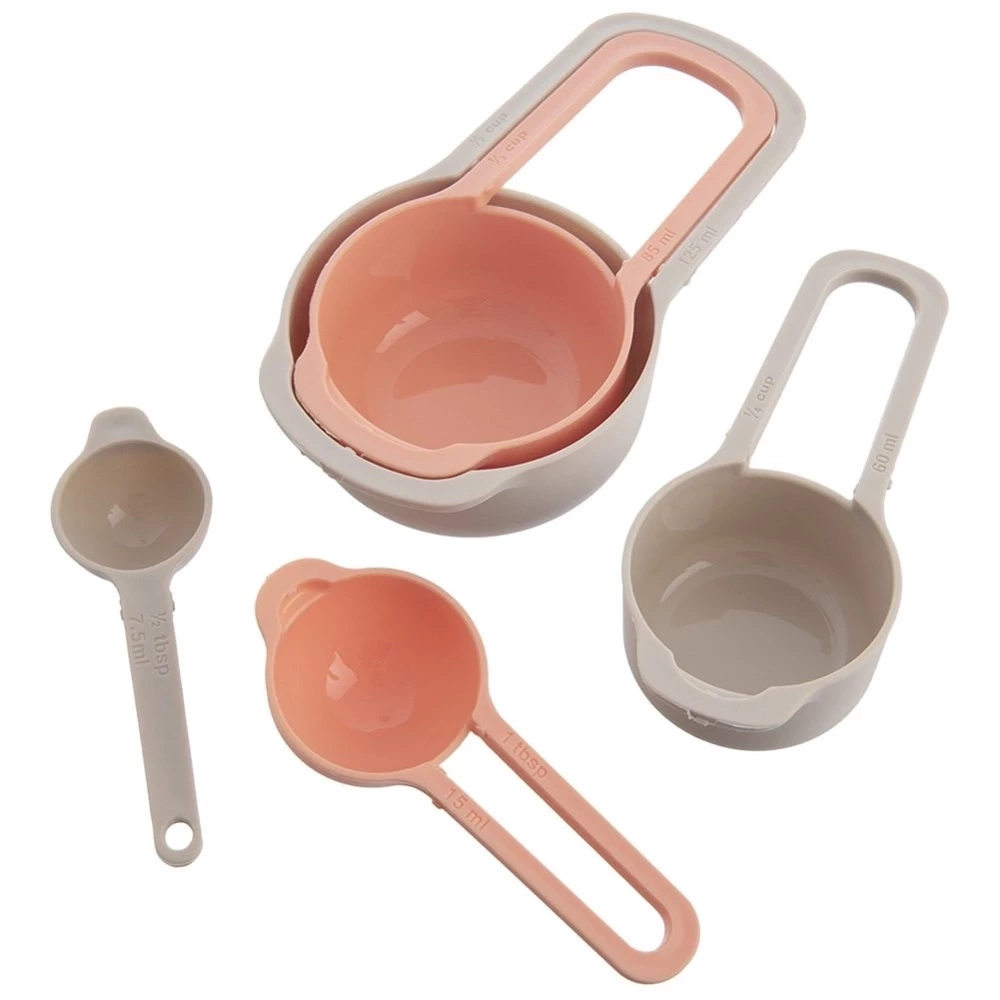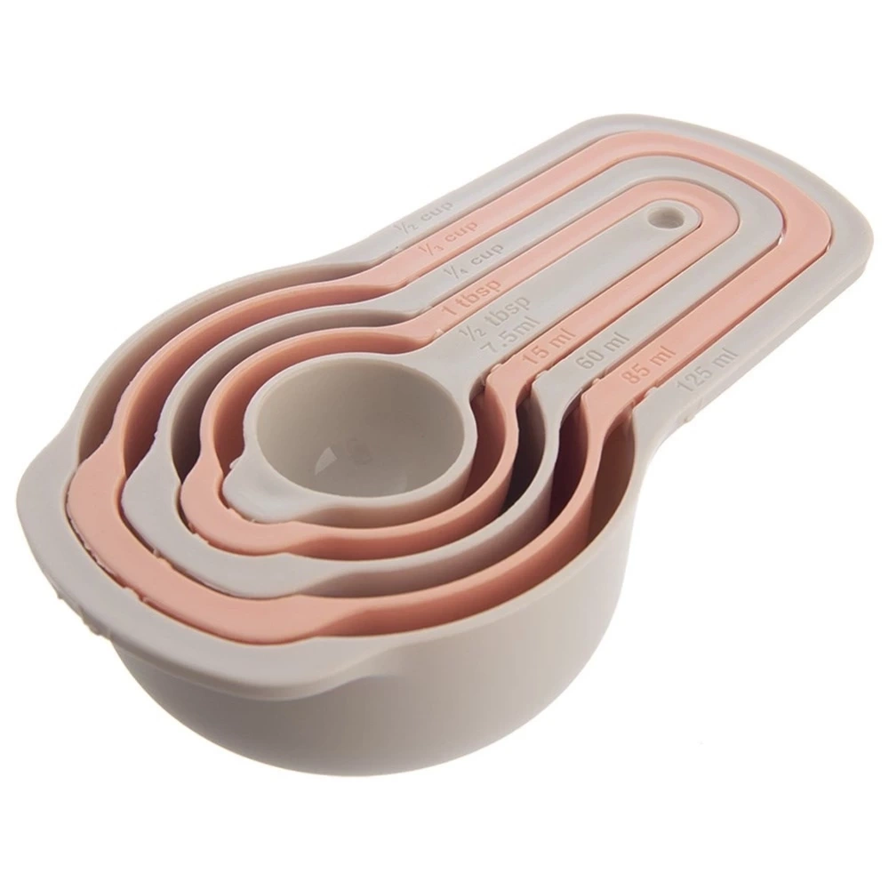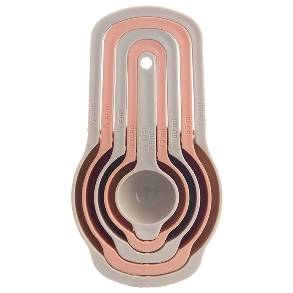 - Zestaw pięciu miarek kuchennych do odmierzania ml, szklanek oraz łyżek. Łatwe w przechowywaniu, gdyż można umieścić jedną miarkę w drugą. Nadają się do zmywarki.