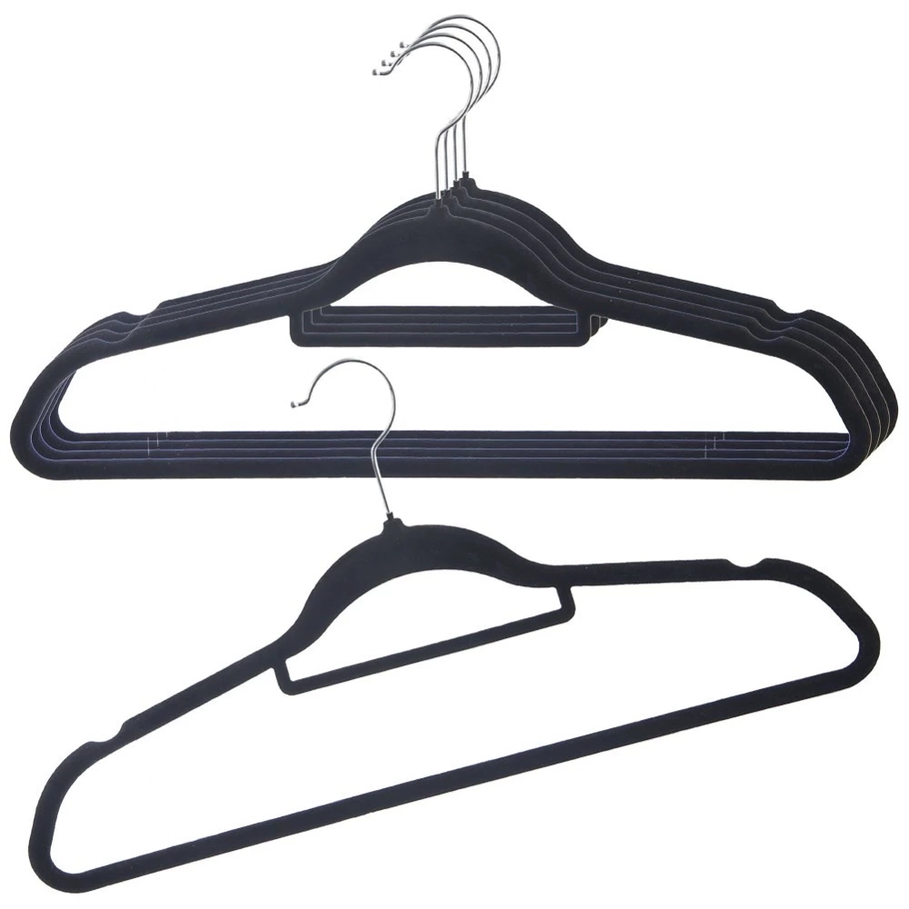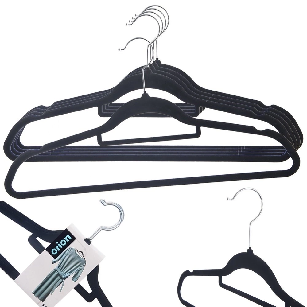 - Zestaw pięciu obrotowych wieszaków na ubrania. Wykonane z wytrzymałych materiałów i pokryte welurem w czarnym kolorze. Posiadają miejsce na szalik, krawat czy pasek.