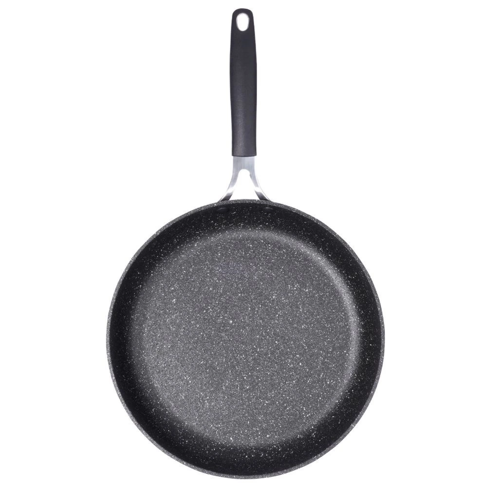 - NIEZAWODNA - Patelnia do smażenia oraz duszenia o średnicy 28 cm. Wymiary zewnętrzne: długość 51 cm, wysokość patelni 4,8 cm. Patelnia jest ciężka i masywna, wykonana z odlewu aluminium z powłoką kamienną.