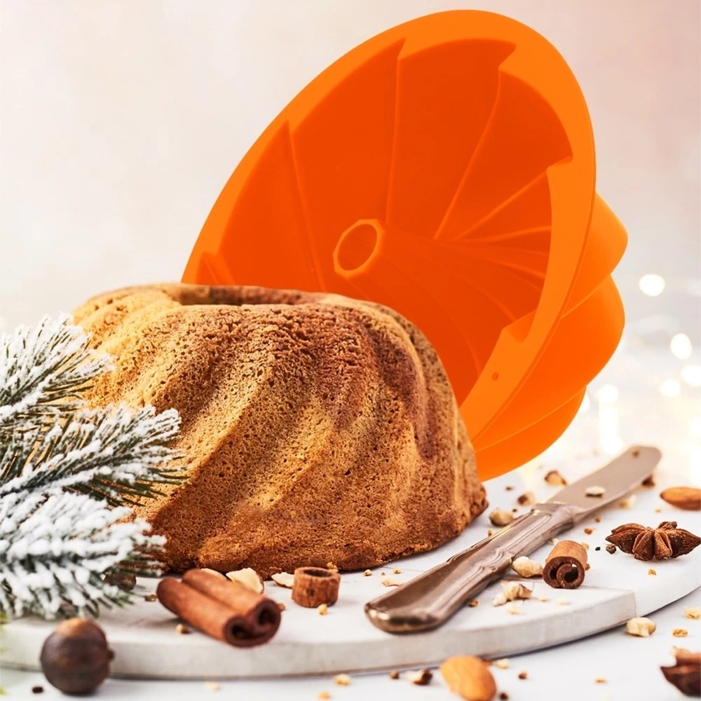 - Forma silikonowa w kolorze pomarańczowym do pieczenia babki. Posiada komin, który nada wyjątkowy kształt babce. Ciasto nie przywiera, idealnie się wyciąga.