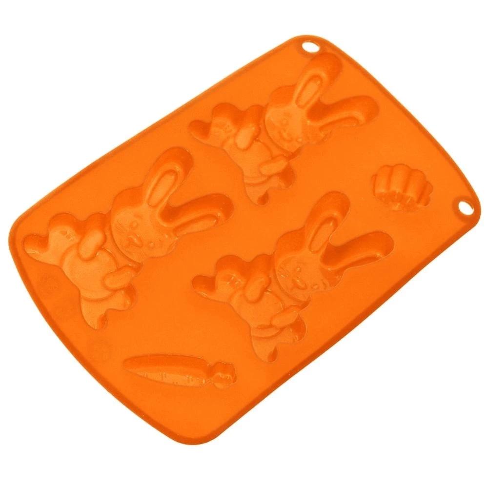 - WIELKANOCNA - Forma do przygotowywania czekoladowych pralin lub ciastek w kształcie króliczka. Forma ma wymiary 21 x 13 x 2 cm. Dzięki niej przygotujemy aż 3 sztuk wielkanocnych słodkości w kształcie zająca oraz dwie w kształcie marchewki i kwiatka.
