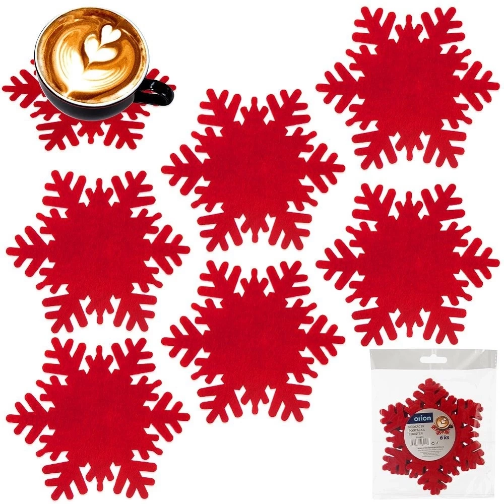 Zestaw sześciu podstawek pod gorące kubki, szklanki, filiżanki, a nawet świeczki. Podstawki wykorzystamy zarówno pod gorące jak i zimne napoje. Kładąc zimne napoje na podstawkach unikniemy skraplania się wody na stolik. Podkładki będą idealnym uzupełnieniem dekoracji stołu w okresie zimowo świątecznym. Oryginalny produkt czeskiej marki Orion. Wyprodukowano zgodnie z europejskimi standardami.