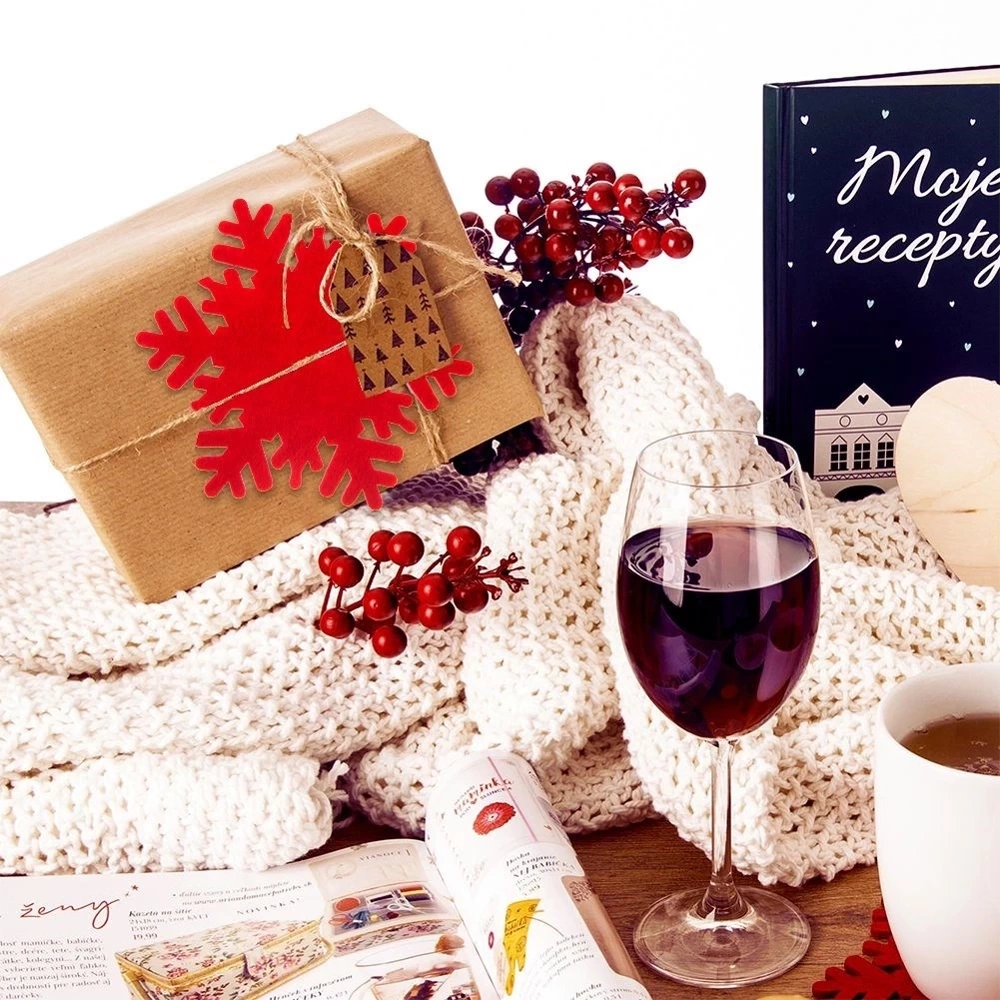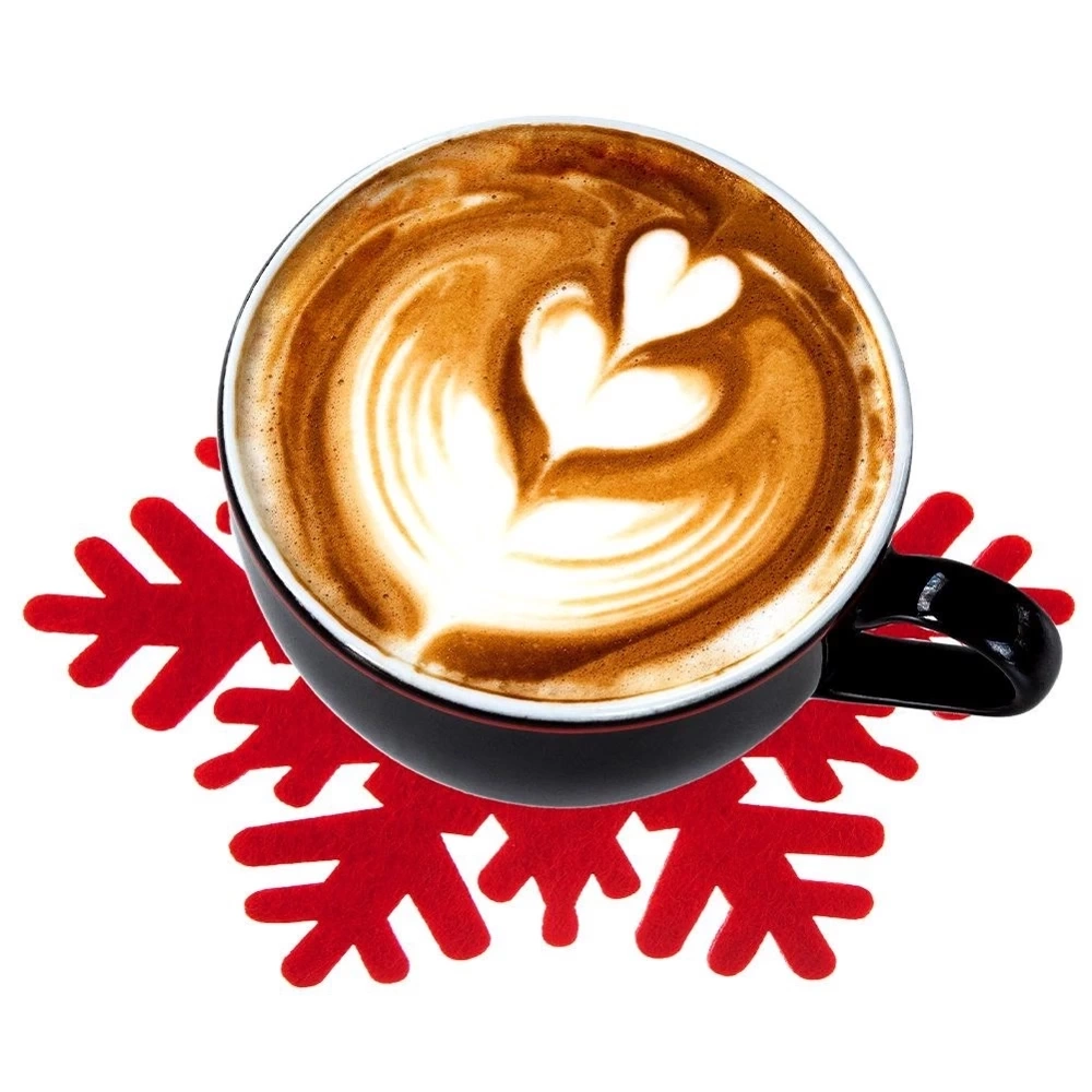 - Komplet sześciu podkładek w kształcie płatków śniegu pod gorące naczynia - szklanki, kubki, garnki, patelnie. Wykonane z filcu w kolorze czerwonym. Przydatne w każdym domu.
