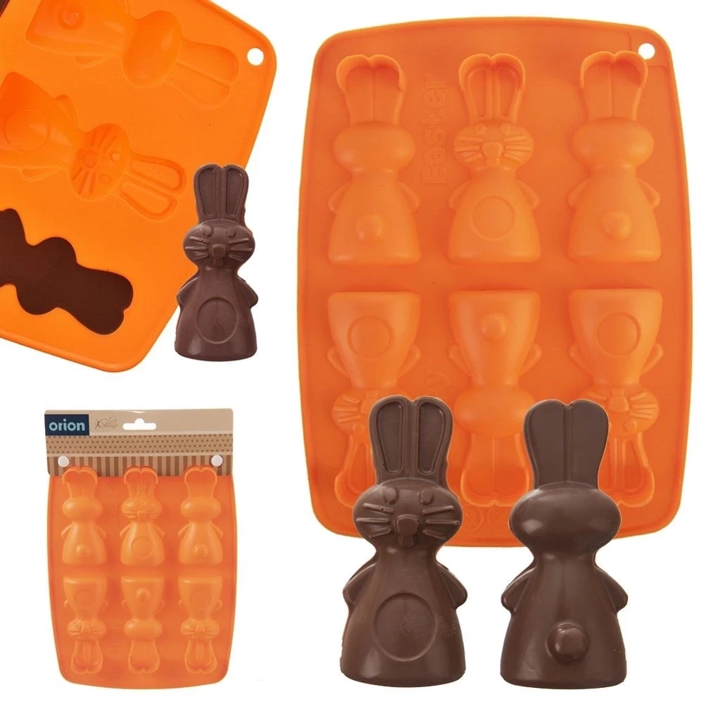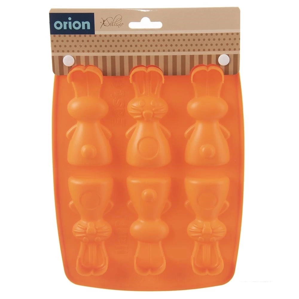 Silikonowa foremka pozwalająca upiec sześć zajączków. Idealnie sprawdzi się w okresie wielkanocnym, gdyż stworzymy w niej słodkości w kształcie zajączków. Możemy przygotować w niej ciasteczka, praliny, czekoladki w uroczym kształcie. Wzór zajączka jest neutralny, dlatego wykorzystamy ją również poza okresem świątecznym. Foremka nie wchłania zapachów i smaków. Forma silikonowa jest lekka, elastyczne, zajmują mało miejsca, odporne na zmiany temperatury. Bardzo dobrze przewodzą ciepło. Oryginalny produkt czeskiej marki Orion. Wyprodukowano zgodnie z europejskimi standardami.