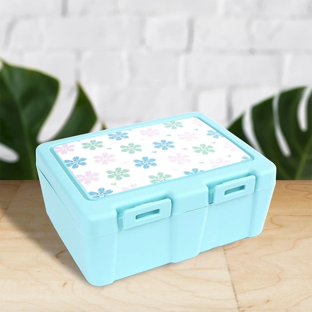 - Pojemnik śniadaniowy zamykany na klips. Wykonany z wysokiej jakości tworzywa z kwiatowym motywem. Posiada dwie przegródki oraz sztućce 2w1.