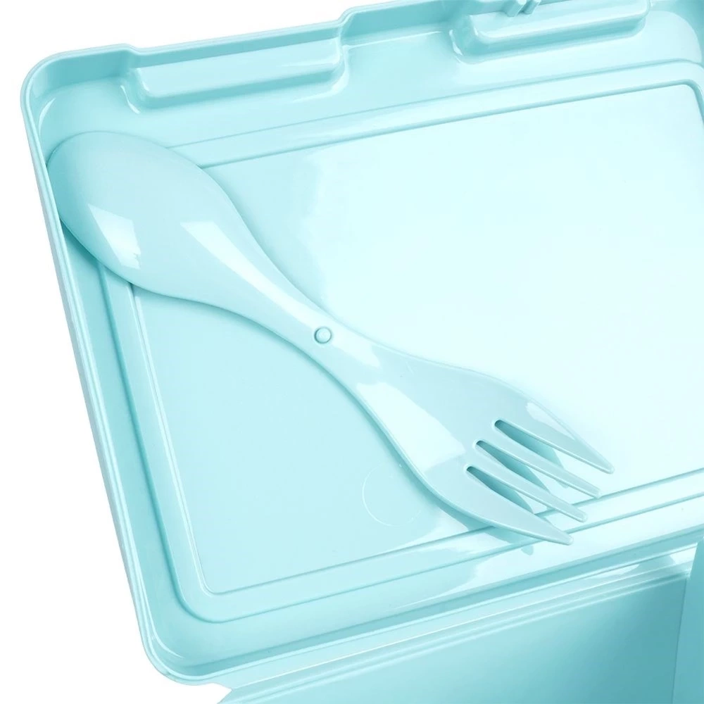 - ŚNIADANIOWY - Pojemnik śniadaniowy z dwoma przegródkami. Dodatkowo wyposażony w sztućce 2w1 o długości 14,5 cm z jednej strony zakończone widelcem a z drugiej łyżką. Mają swoje dedykowane miejsce w pojemniku. Pojemnik sprawdzi się na kanapki, sałatki i inne przekąski. Wymiary pojemnika wynoszą 18 x 14 x 7,5 cm a pojemność 1 litr.