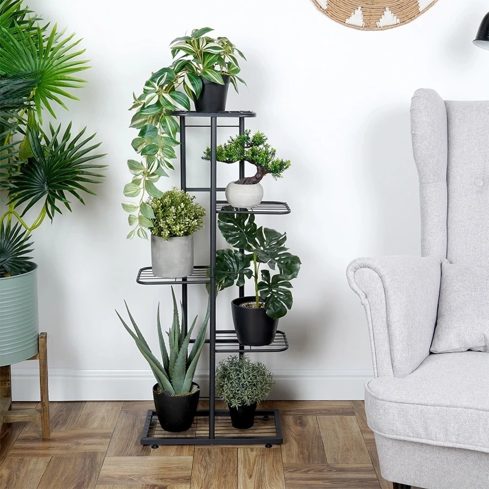 - Kwietnik wykonany z metalu w kolorze czarnym. Konstrukcja pozwala na przechowywanie donic z kwiatami lub dekoracji na pięciu poziomach. Utrzymany w industrialnym stylu.