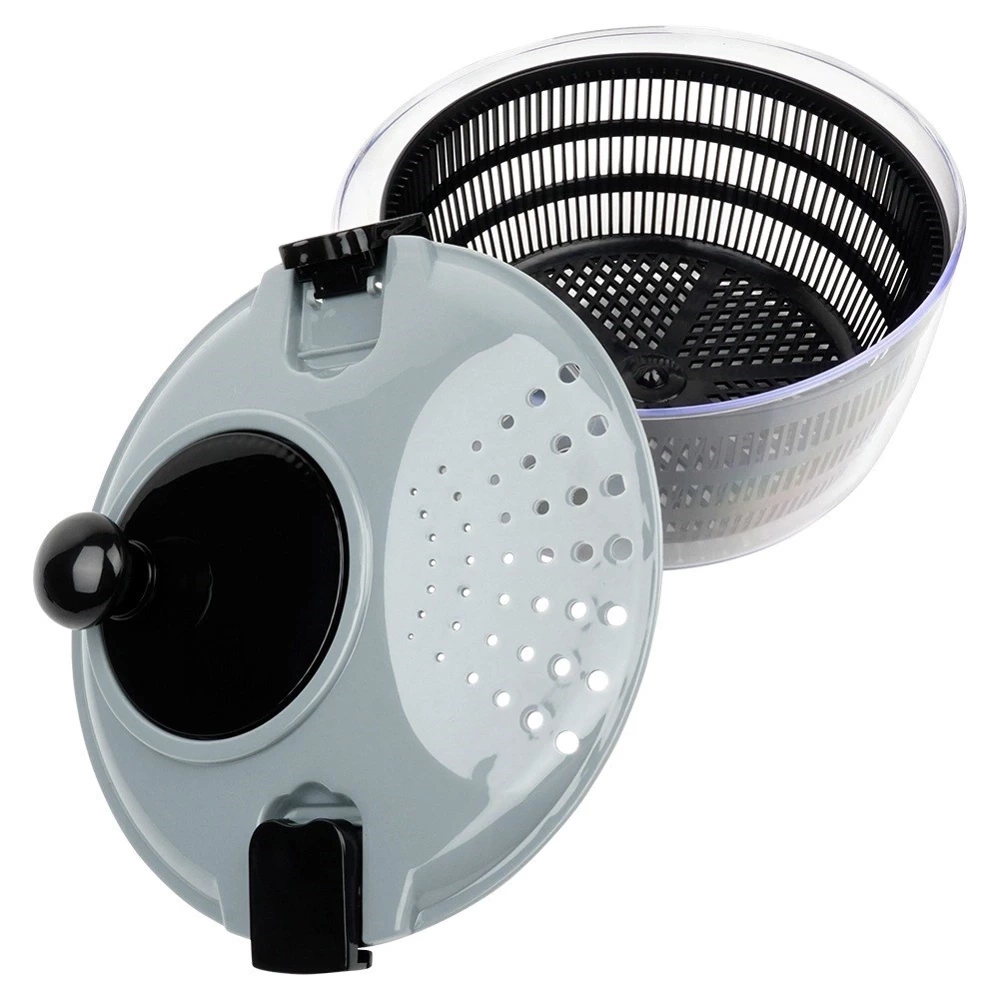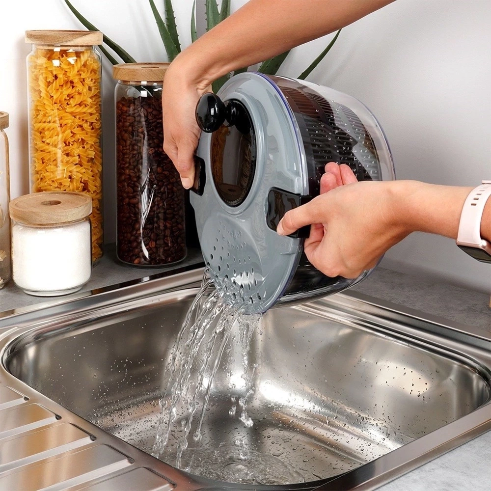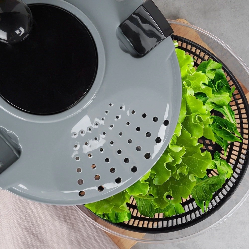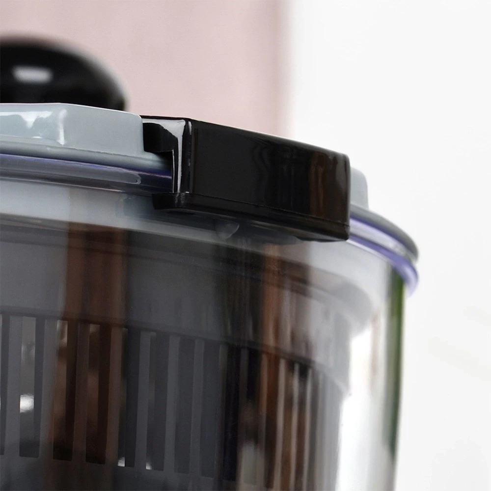 - Szybkie osuszanie sałaty - Wirówka pozwala na błyskawiczne osuszenie sałaty, dzięki czemu można szybko przygotować świeże i chrupiące sałatki. W ciągu kilku sekund pozbędziemy się nadmiaru wody i uzyskamy chrupiącą sałatę. Pokrywka zawiera otwory, które pozwolą w szybki sposób odlać wodę.