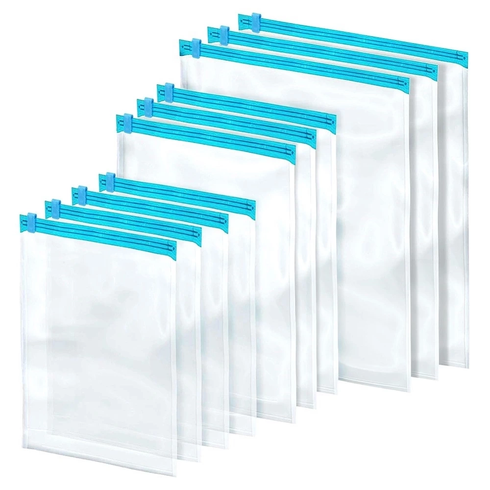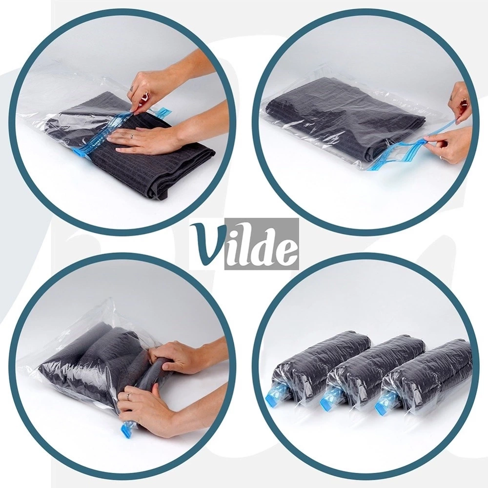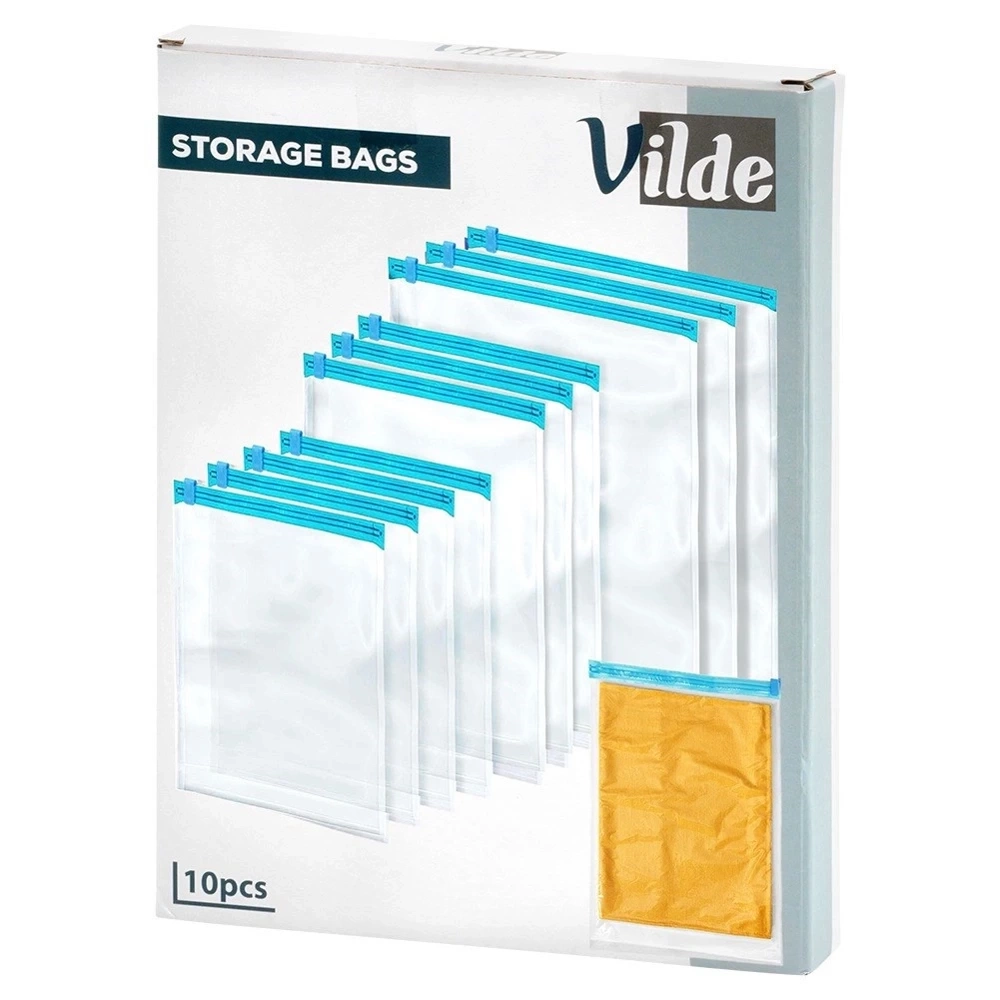 Zestaw 10 sztuk worków kompresyjnym ze szczelnym zamknięciem. Worki mają uniwersalne zastosowanie i są przydatne w każdym domu. Worki można używać wielokrotnie i zamykać wielokrotnie. Torby kompresyjne to praktyczne rozwiązanie, które pozwala zaoszczędzić miejsce w bagażu i szafie. Dzięki trzem różnym rozmiarom idealnie sprawdzają się w przechowywaniu zarówno małych, jak i dużych przedmiotów. Zapewniają ochronę przed wilgocią, kurzem oraz nieprzyjemnymi zapachami. Oryginalny produkt marki Vilde. Wyprodukowano zgodnie z europejskimi standardami.