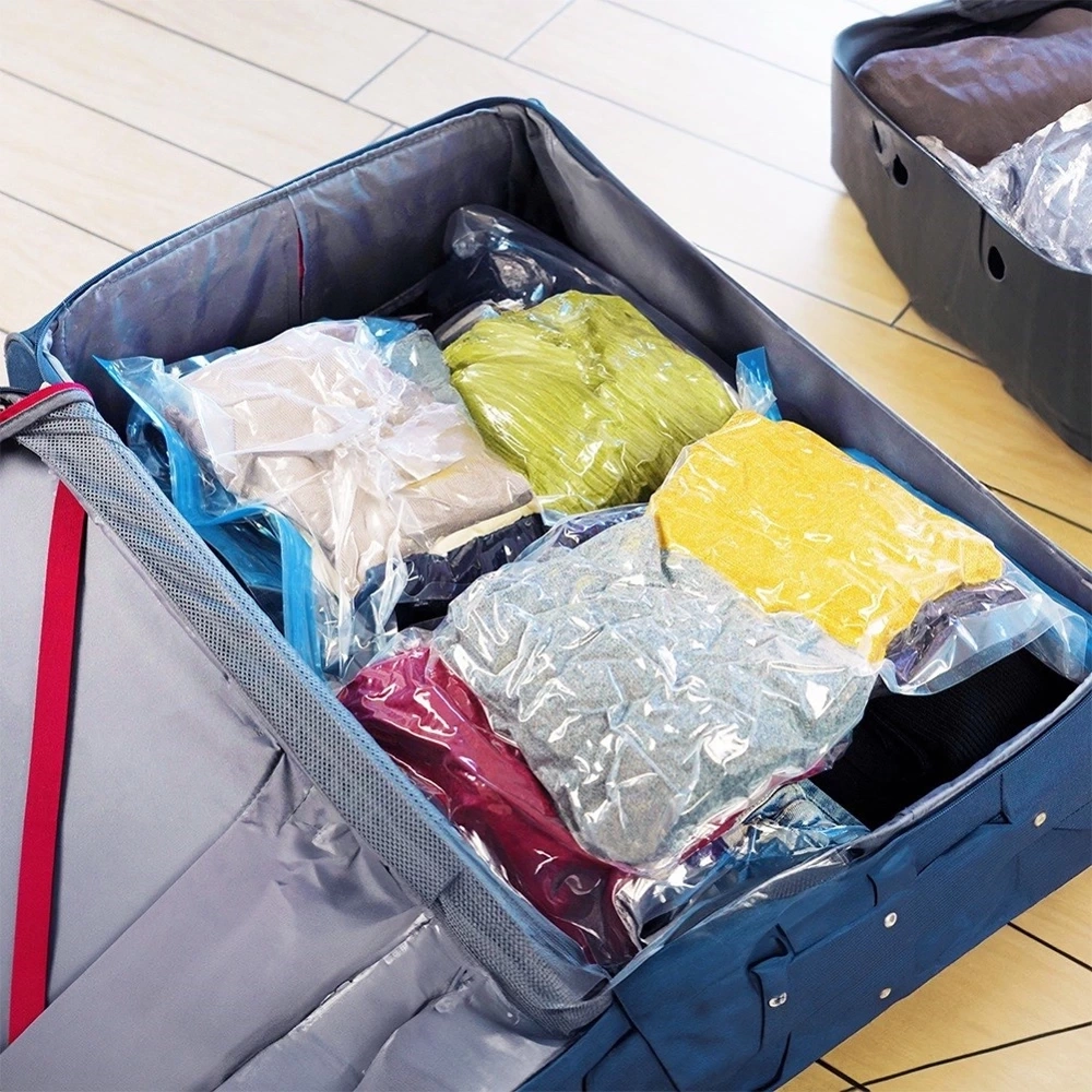 - Łatwa kompresja - Prosty w obsłudze mechanizm kompresji bez potrzeby użycia odkurzacza - wystarczy zrolować torebkę, aby usunąć z niej powietrze, co sprawia, że pakowanie staje się szybkie i wygodne.