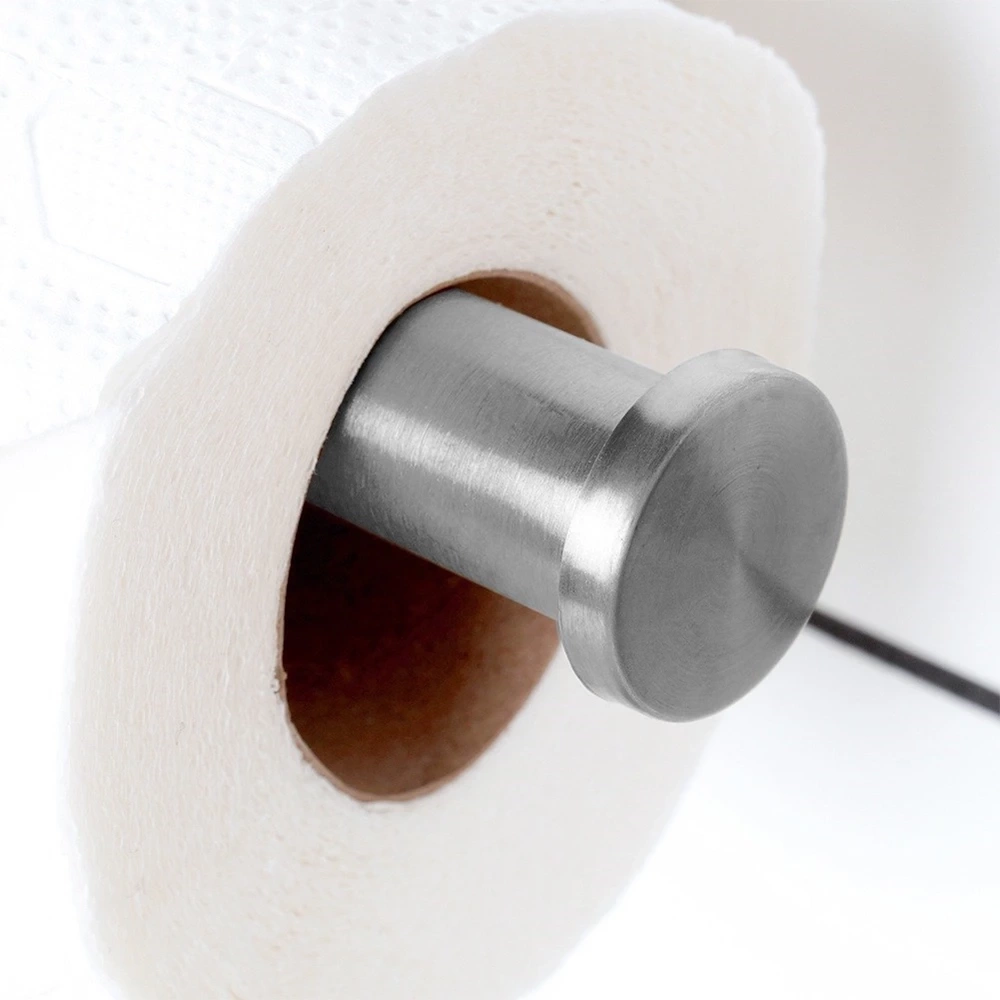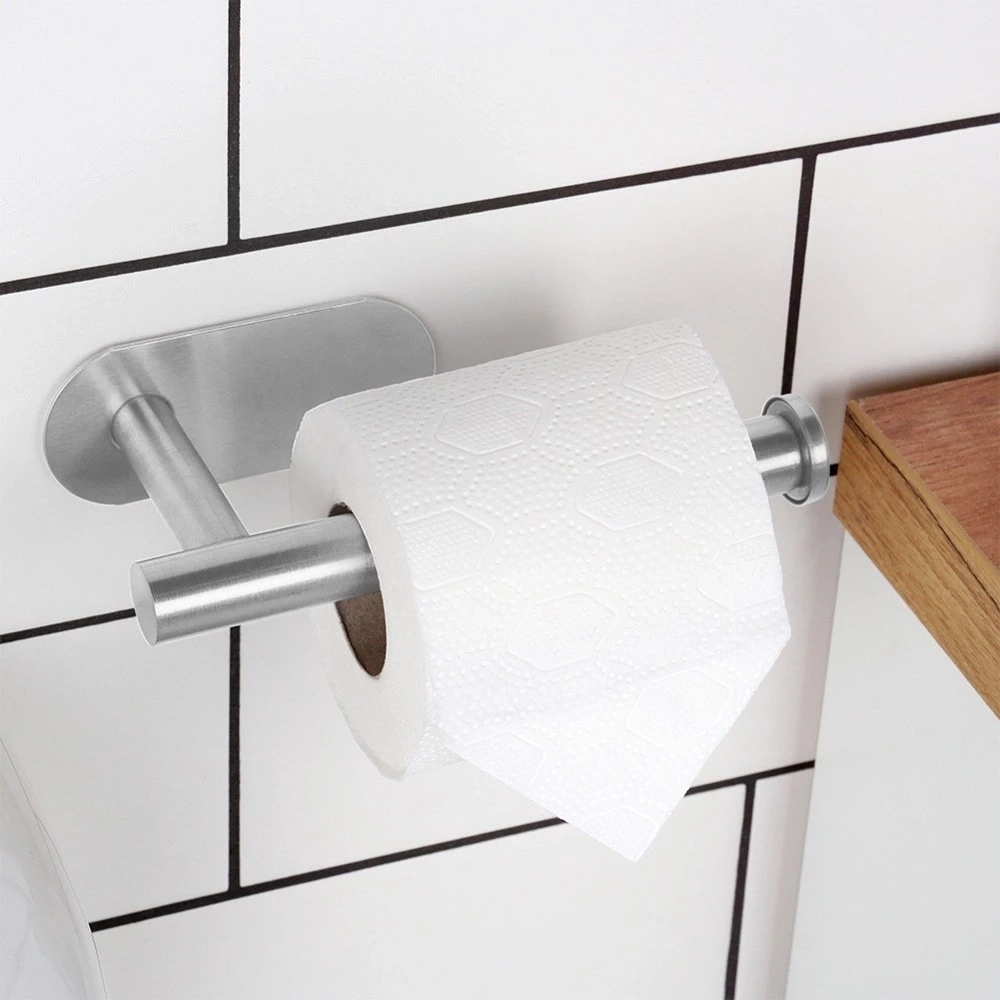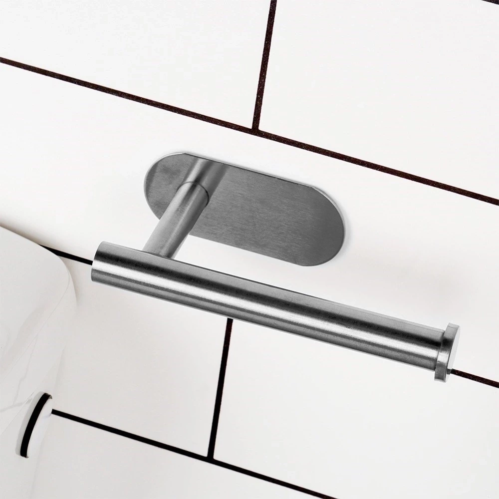 - Łazienkowy uchwyt na papier toaletowy montowany za pomocą dwustronnej taśmy. Wykonany ze stali nierdzewnej w srebrnym kolorze. Przydatny w każdej łazience.