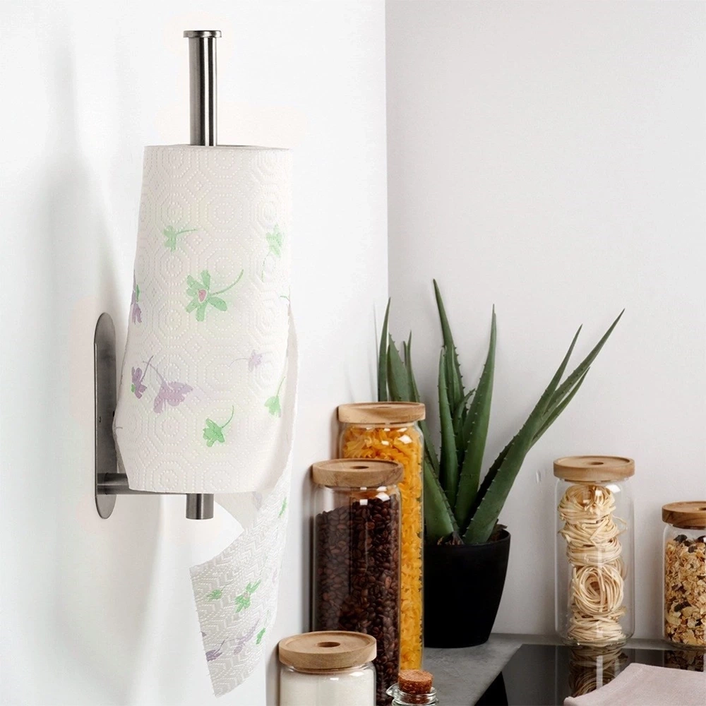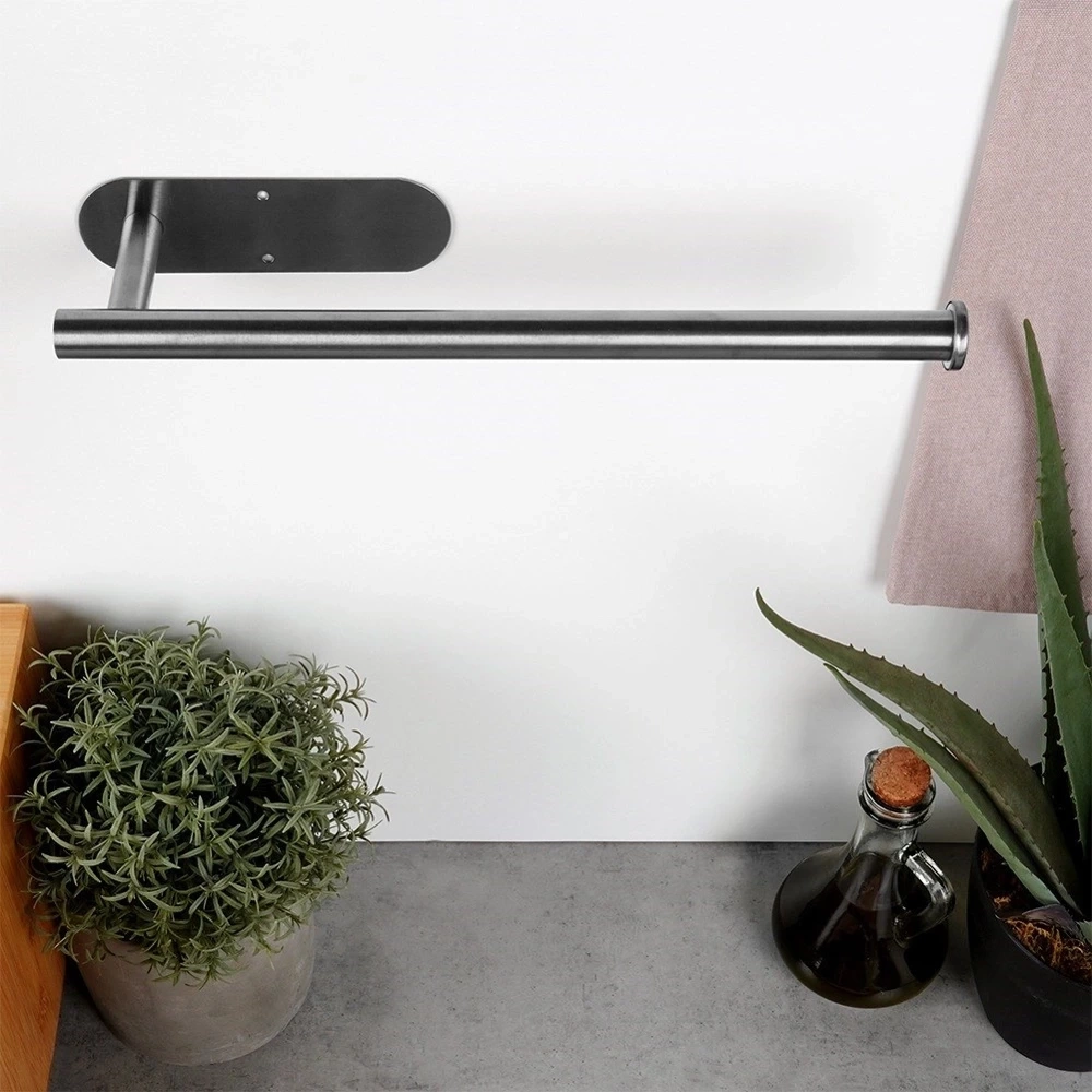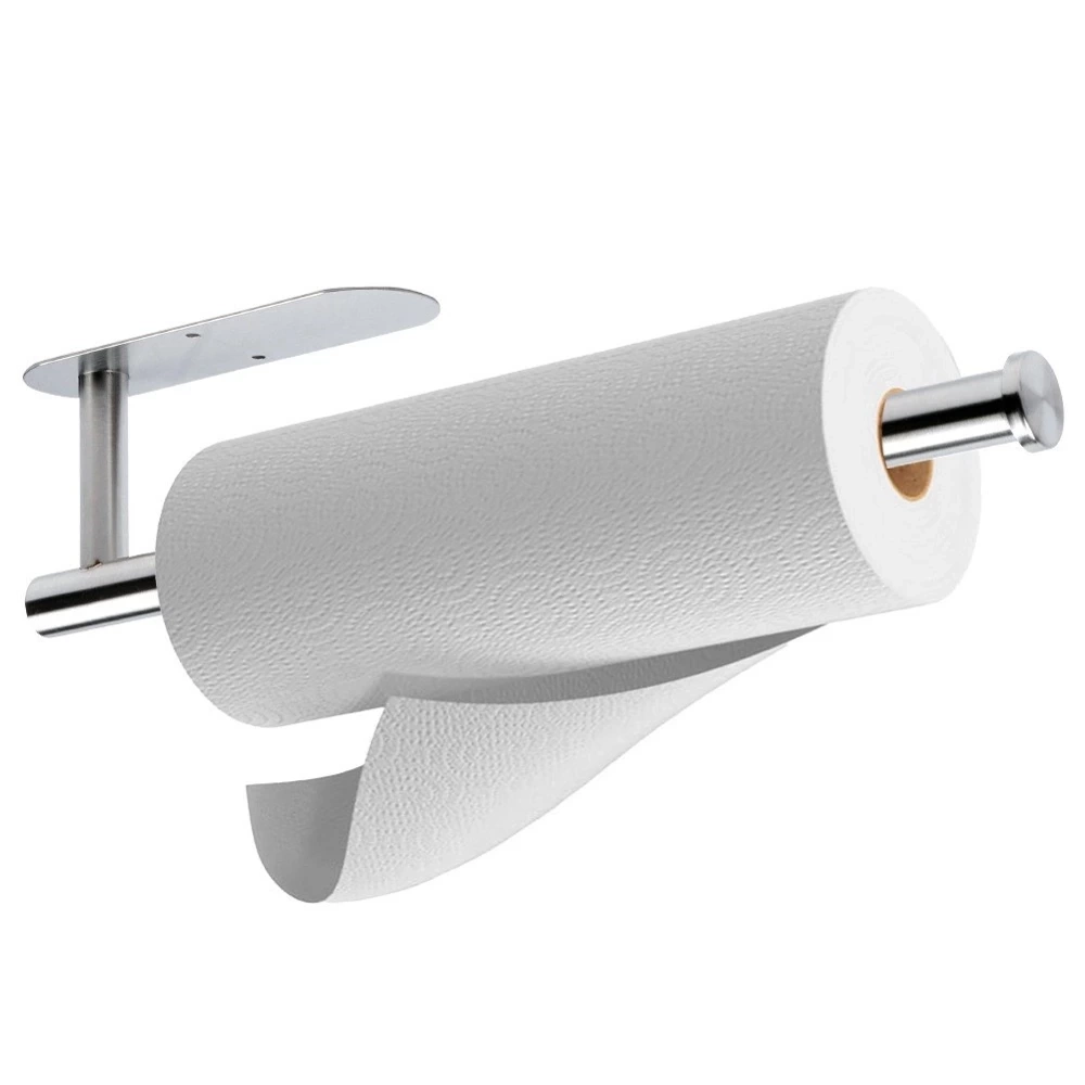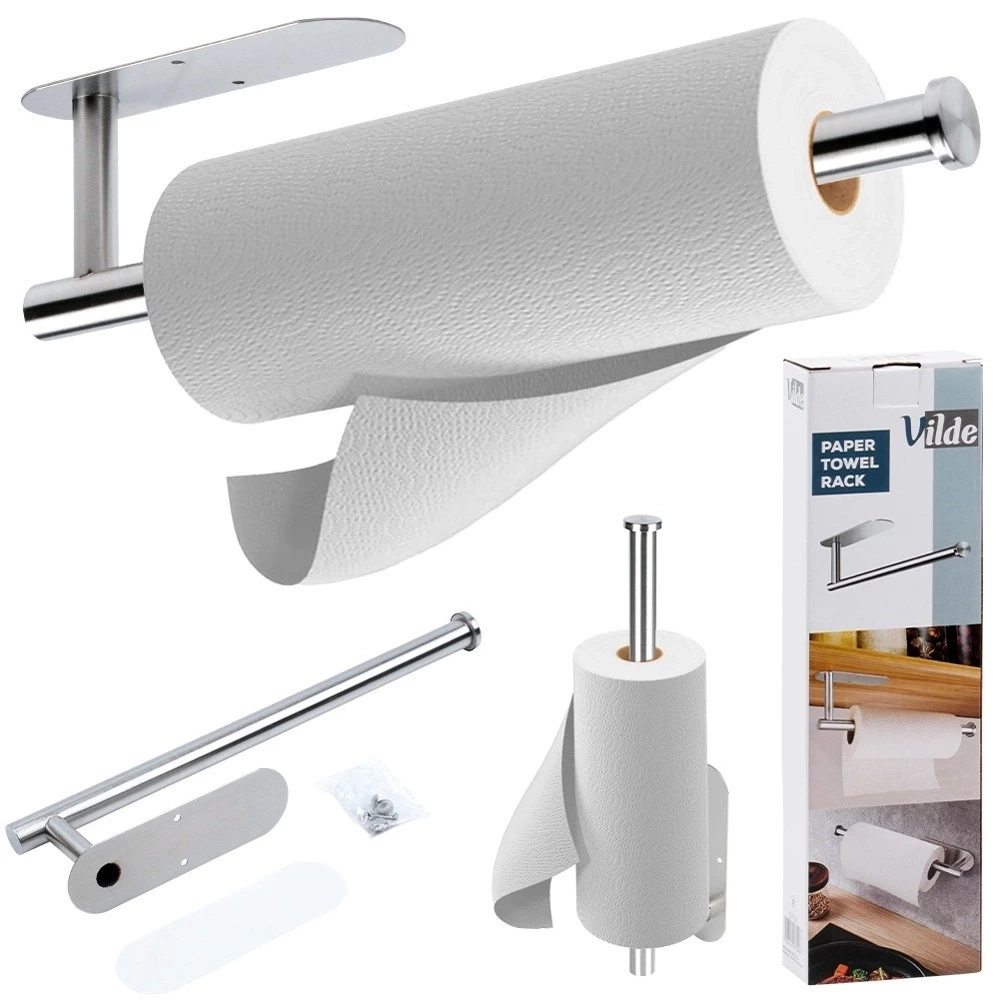 - Wieszak kuchenny na ręczniki papierowe. Wykonany ze stali nierdzewnej. Wyposażony w mocną taśmę dwustronną, która pozwoli na bezinwazyjny montaż. W zestawie również śrubki.