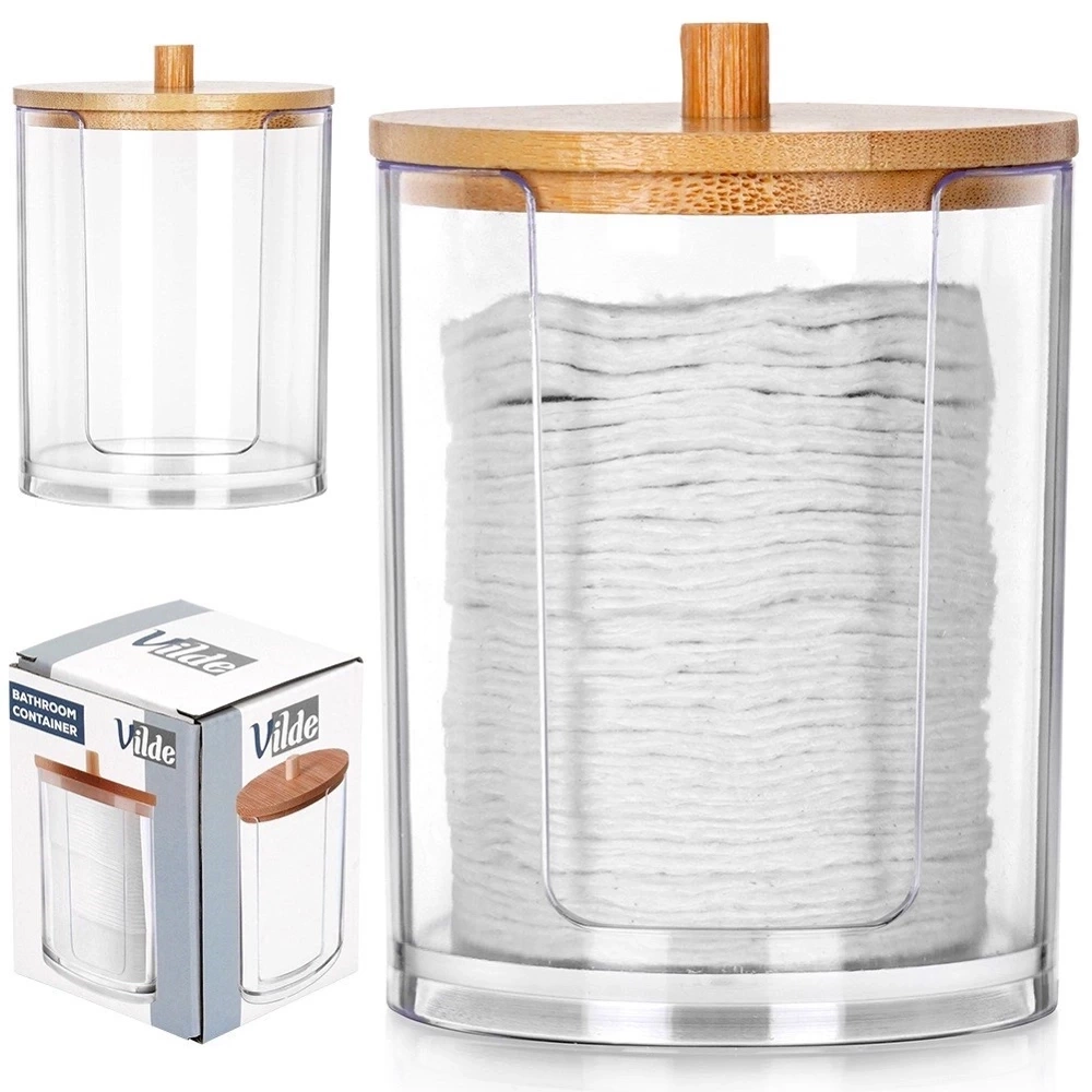 Pojemnik na płatki kosmetyczne to praktyczny dodatek do łazienki. Przezroczysty kolor pozwoli zobaczyć, ile płatków zostało. Bambusowa pokrywka chroni płatki przed kurzem i dodaje elegancji. Jest kompaktowy, ale mieści sporo patyczków, a jego uzupełnianie jest szybkie i wygodne. Oryginalny produkt marki Vilde. Wyprodukowano zgodnie z europejskimi standardami.