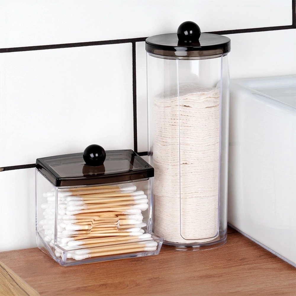 - Praktyczny pojemnik na patyczki kosmetyczne z podajnikiem. Posiada pokrywkę w kolorze czarnym. Przydatne w każdej łazience.