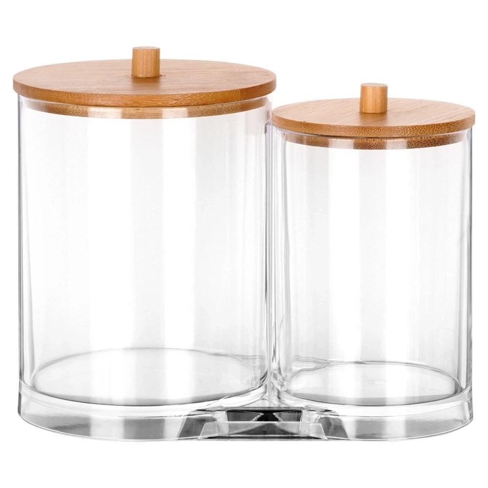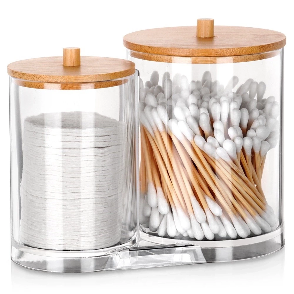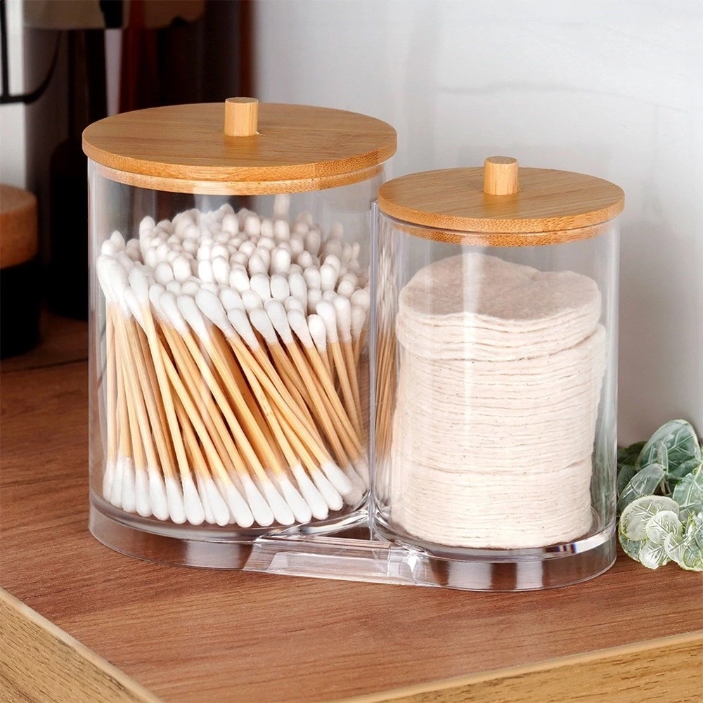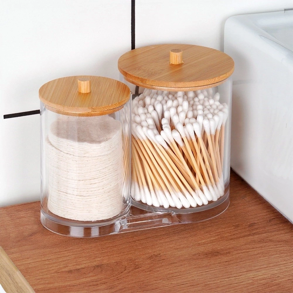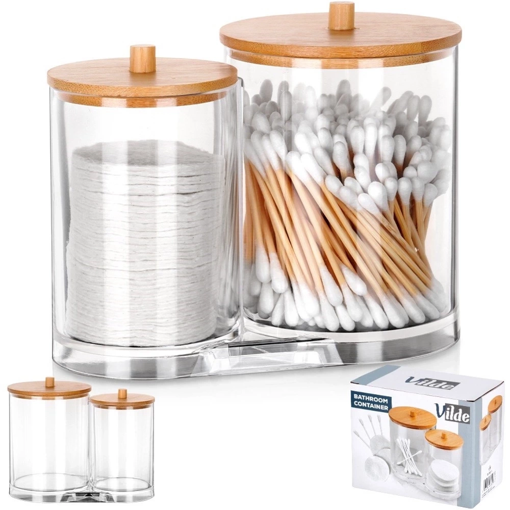 - Zestaw 2 pojemników na płatki i patyczki kosmetyczne z bambusowymi pokrywkami to praktyczne rozwiązanie do każdej łazienki. Pomogą w uporządkowaniu przestrzeni.