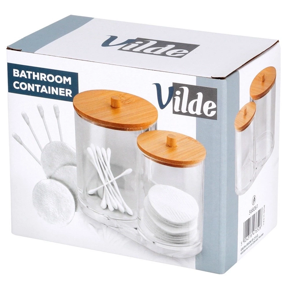 Zestaw dwóch pojemników na patyczki lub płatki kosmetyczne to praktyczny dodatek do łazienki. Przezroczysty kolor pozwoli zobaczyć, ile patyczków lub płatków zostało. Zestaw wyróżnia się nowoczesnym, prostym wzornictwem, które doskonale wpasowuje się w wystrój każdej łazienki. Oryginalny produkt marki Vilde. Wyprodukowano zgodnie z europejskimi standardami.