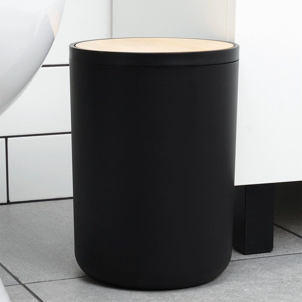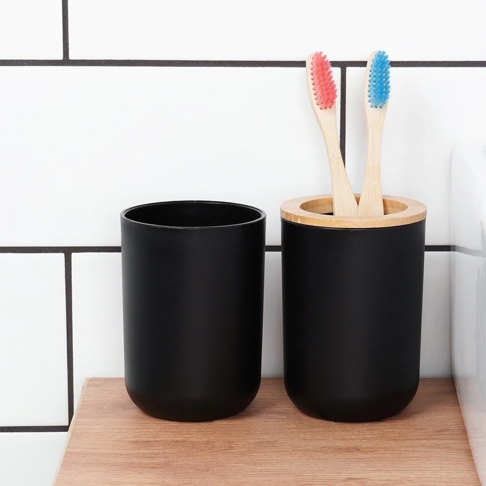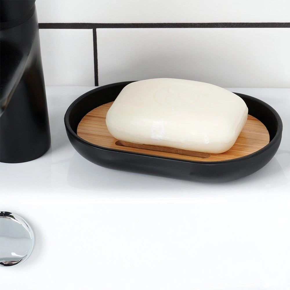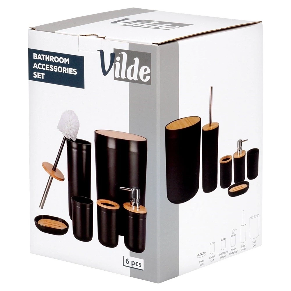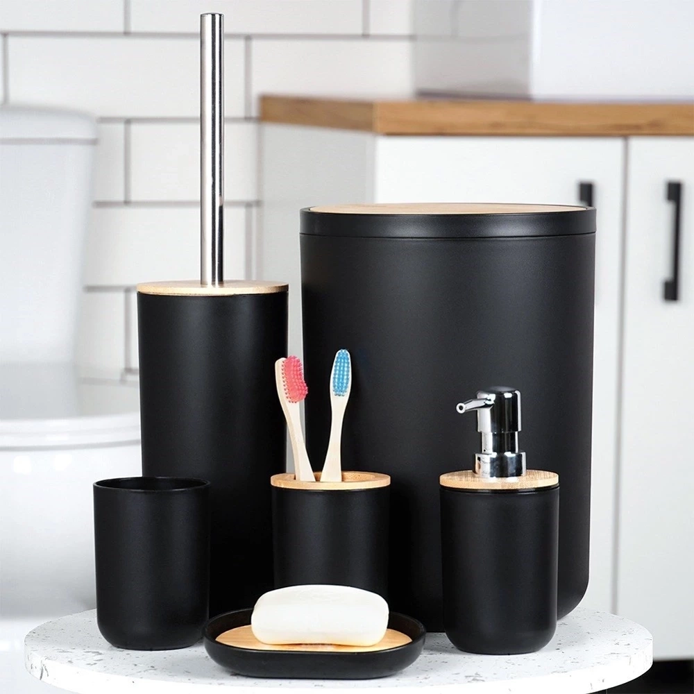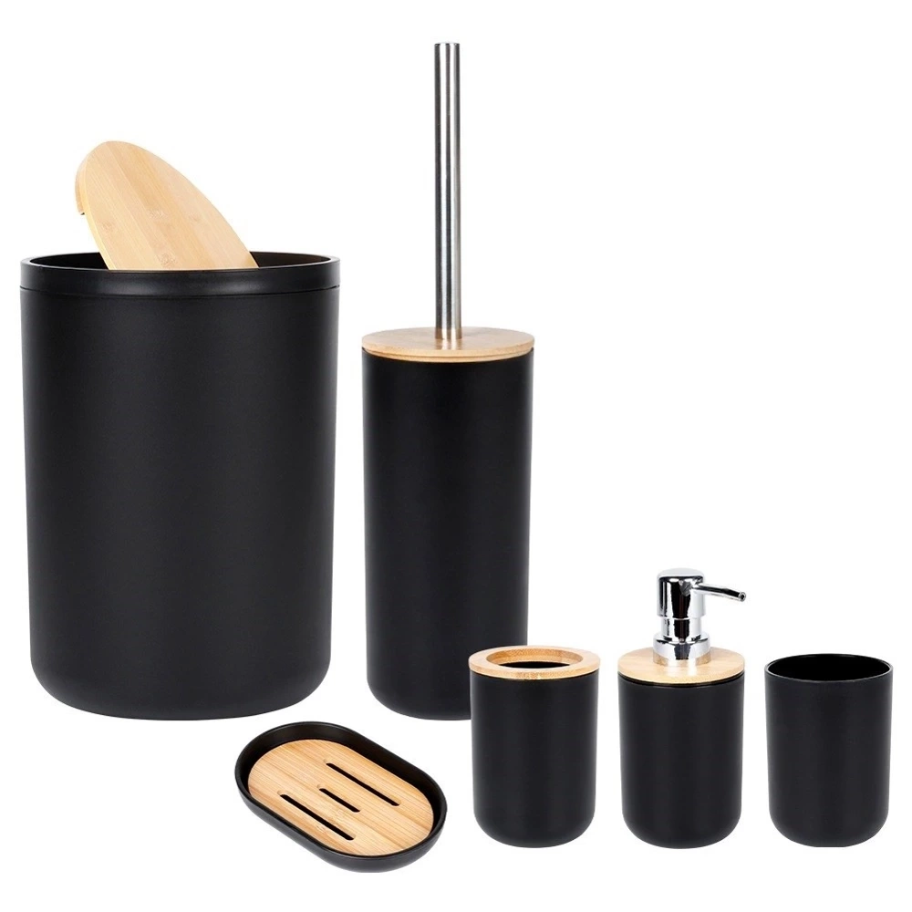 - Przydatny zestaw akcesoriów łazienkowych w czarnym kolorze z elementami bambusowymi. Składający się z: dozownika na mydło, mydelniczki, 2x kubka, szczotki do WC oraz kosza na śmieci.