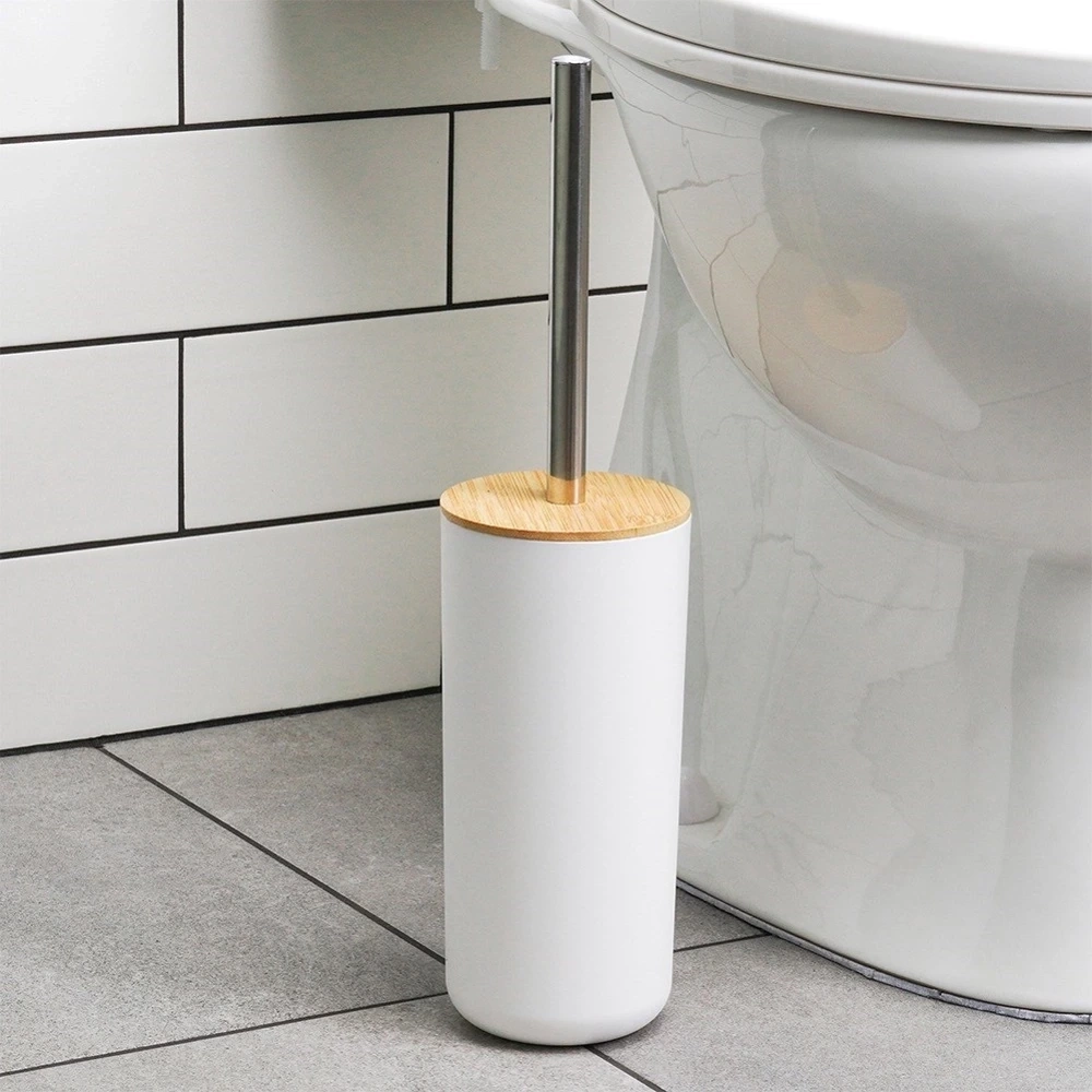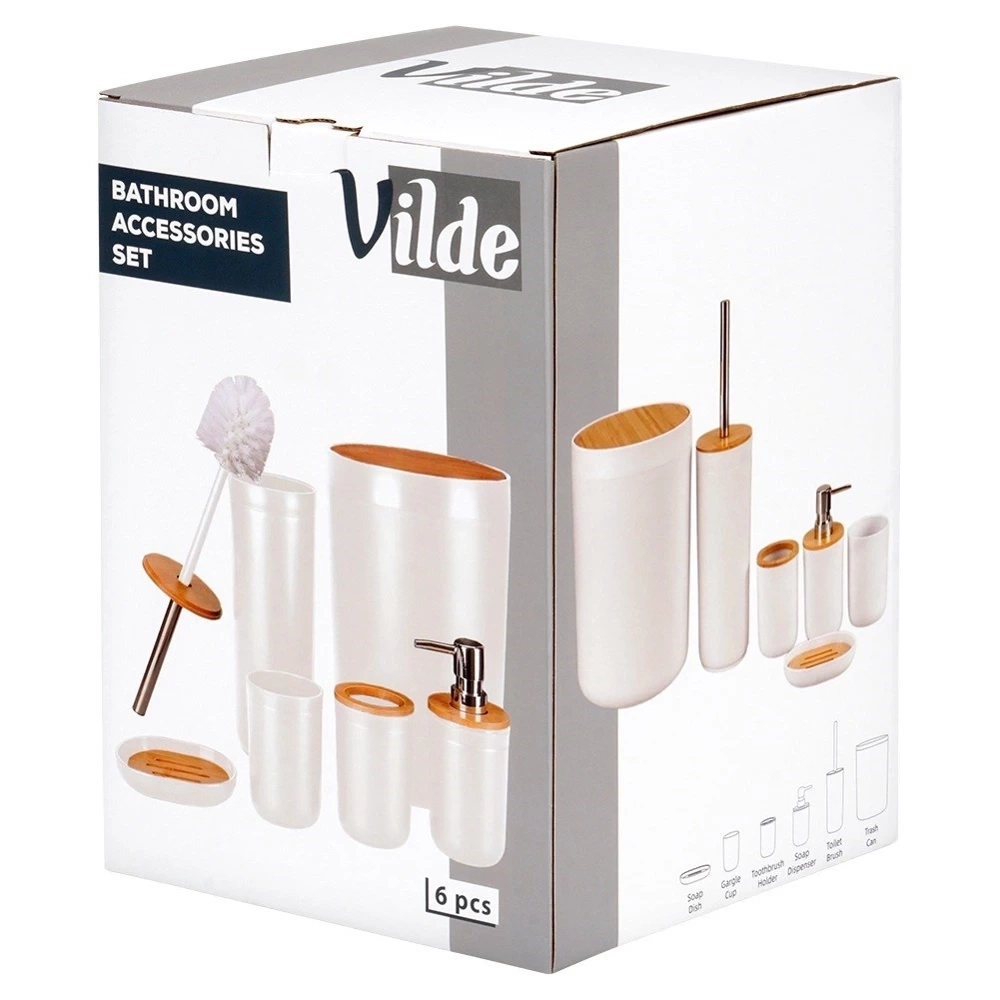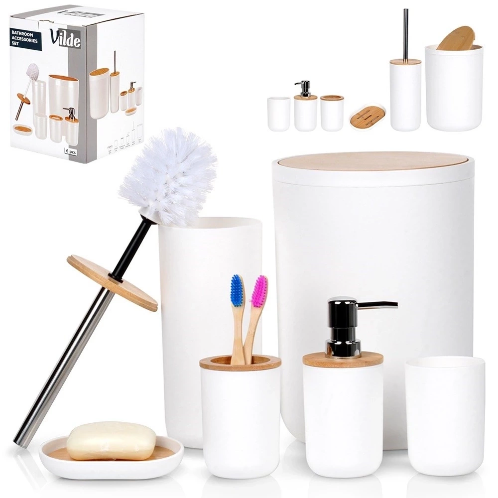 - Przydatny zestaw akcesoriów łazienkowych w białym kolorze z elementami bambusowymi. Składający się z: dozownika na mydło, mydelniczki, 2x kubka, szczotki do WC oraz kosza na śmieci.