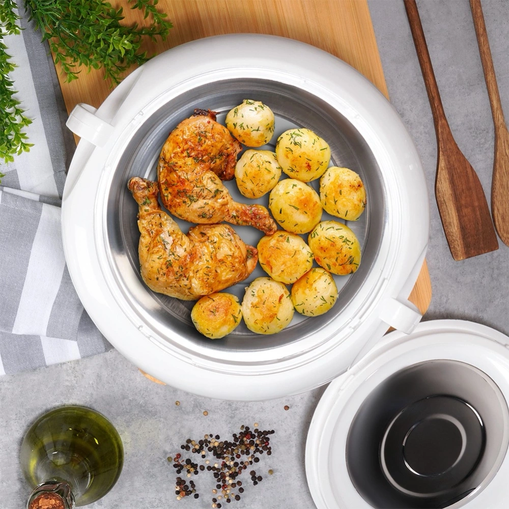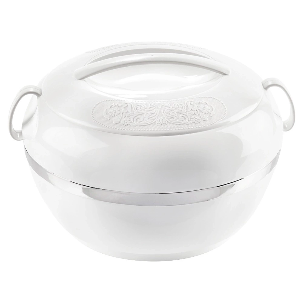 - WYTRZYMAŁA - Termomisa z zewnątrz wykonana z tworzywa w kolorze białym, wewnątrz ze stali nierdzewnej. Pokrywa posiada efektowny dekor.