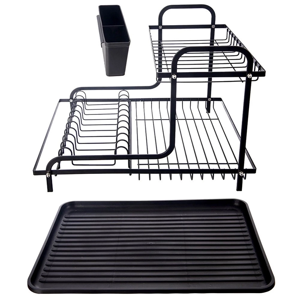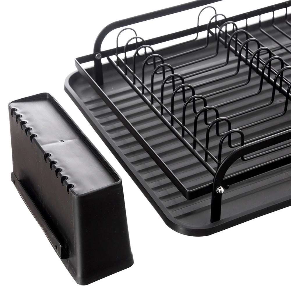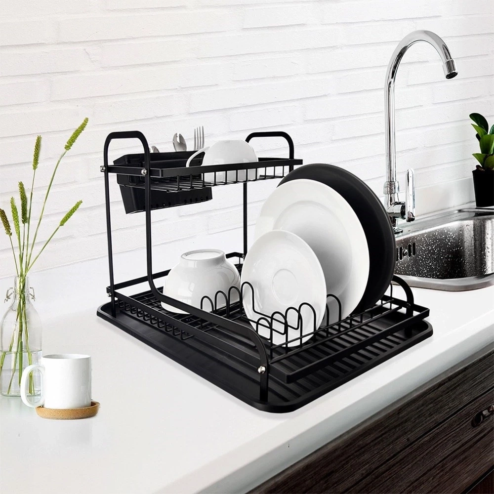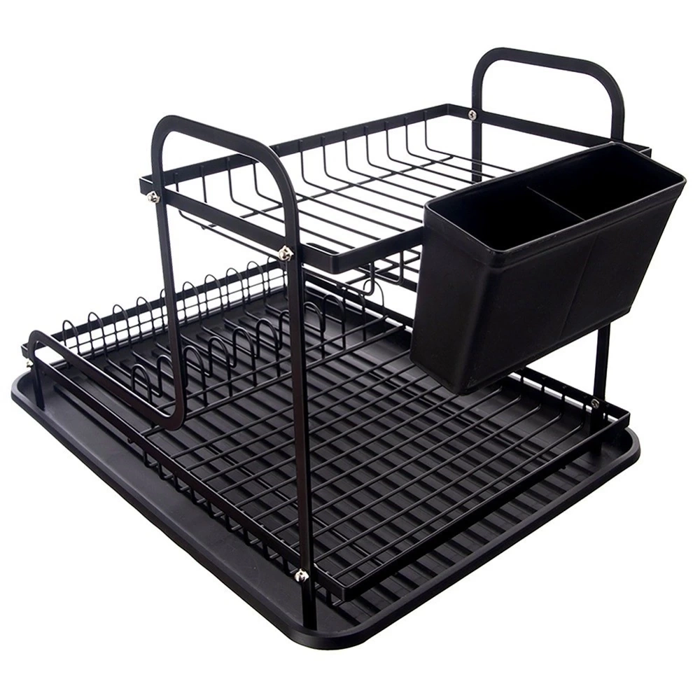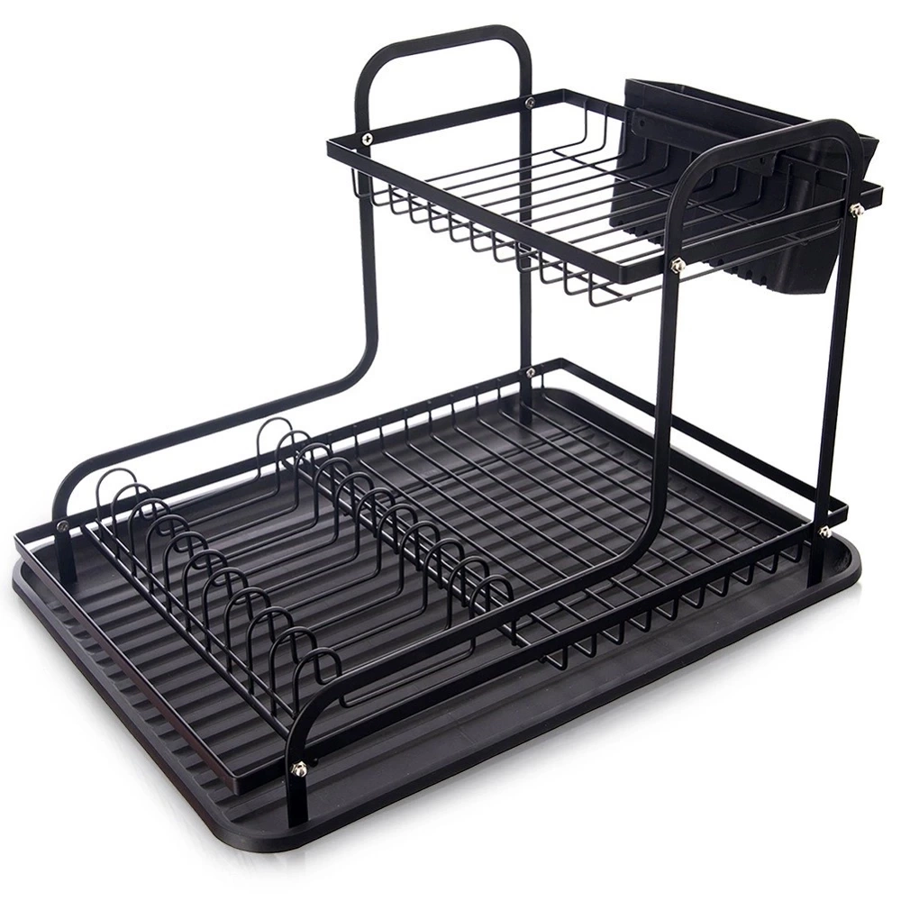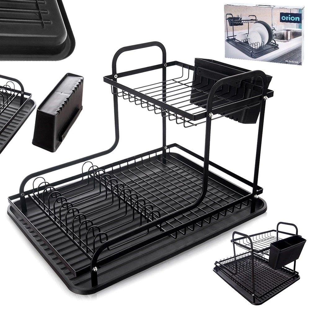 - Elegancka, dwupoziomowa suszarka do naczyń w kolorze czarnym. Posiada miejsce na talerze, szklanki. Wyposażona w tacę ociekową oraz ociekacz na sztućce.