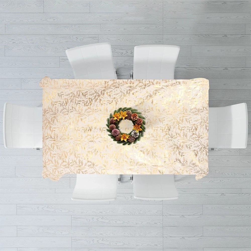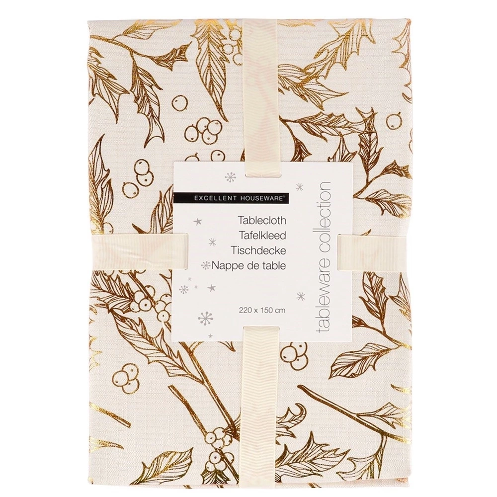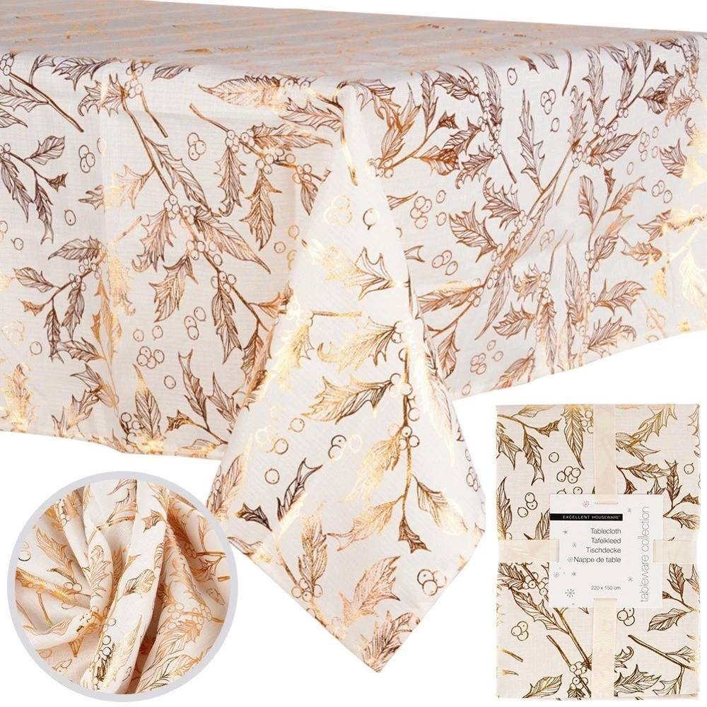 - Trwały i odporny - Obrus wykonany z poliestru w kolorze beżowym z pięknym, świątecznym motywem w złotym kolorze.