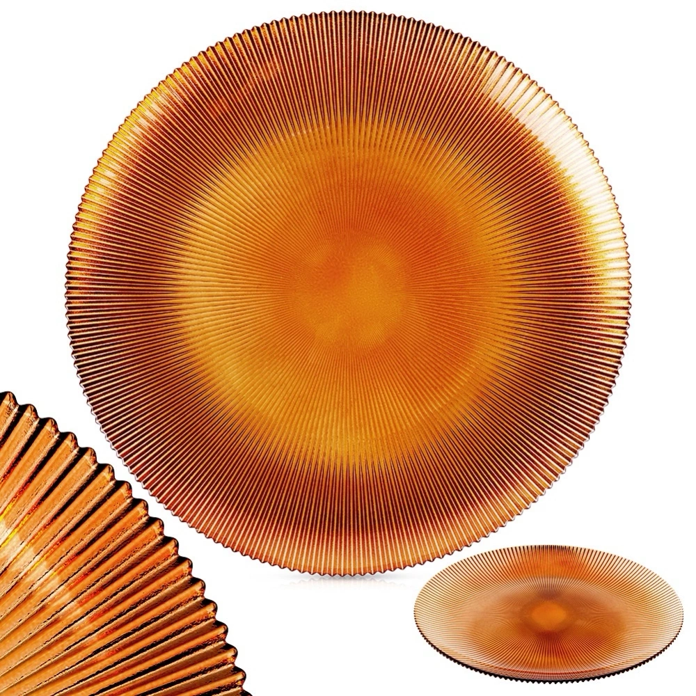 - Duży uniwersalny talerz, który może pełnić rolę patery. Talerz ma średnicę 33 cm i jest wykonany ze szkła w bursztynowym kolorze. Idealny do podawania ciast, przekąsek, potraw.
