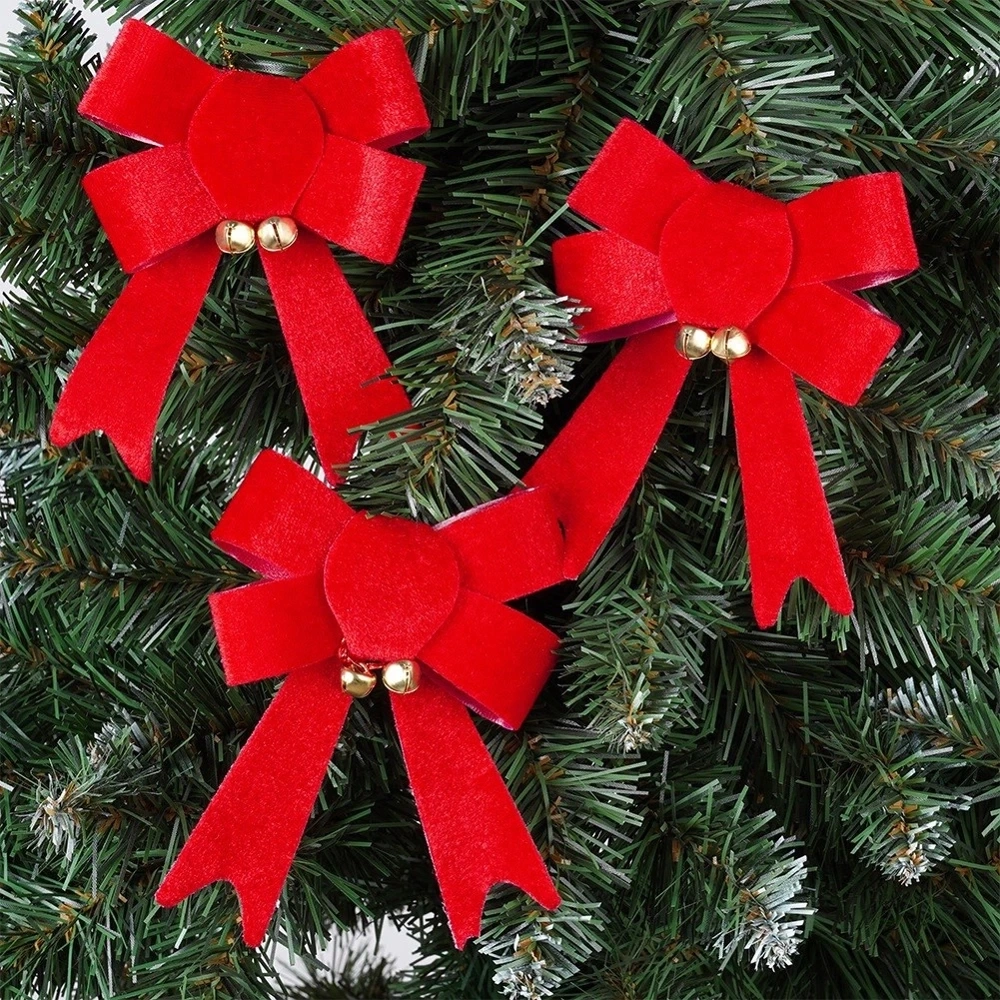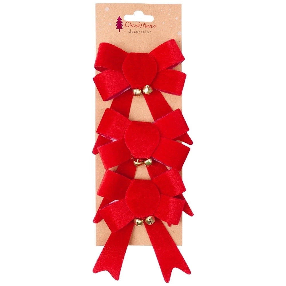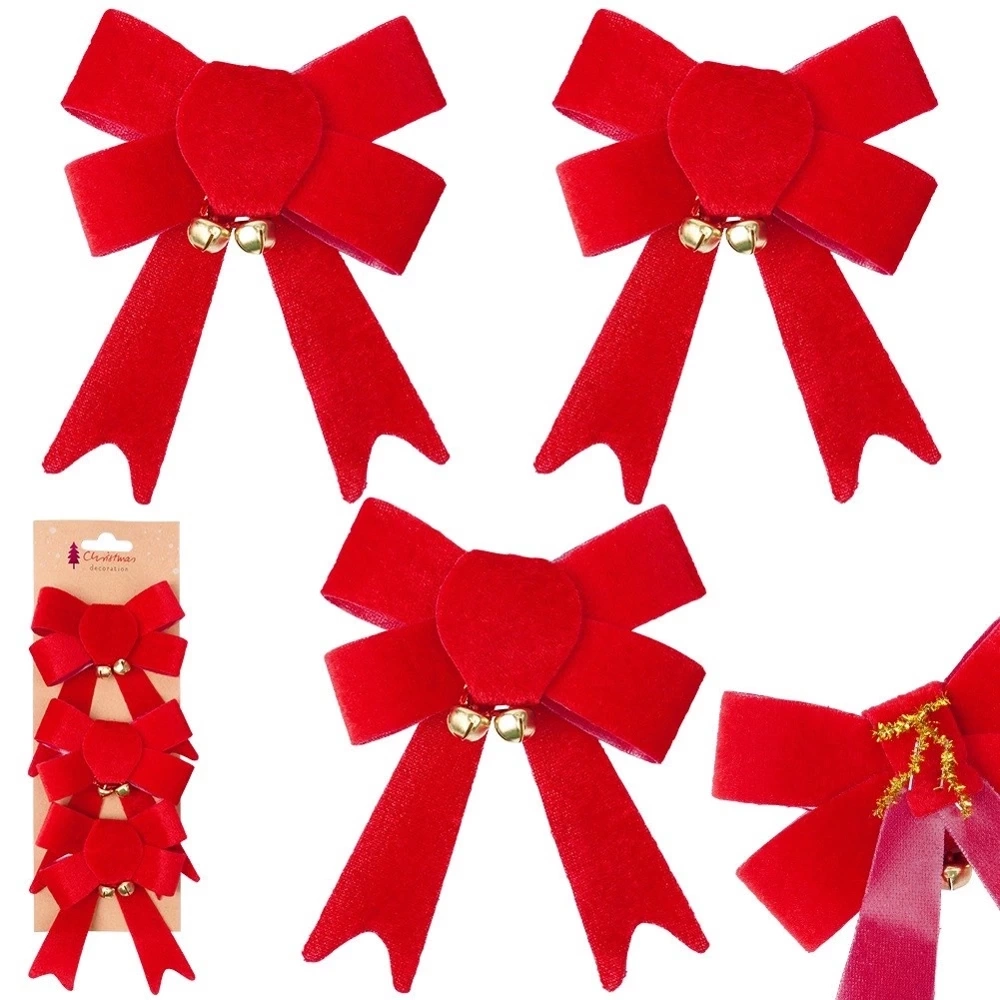 - Zestaw trzech welurowych kokard dekoracyjnych w czerwonym kolorze ze złotymi dzwoneczkami. Idealne do dekoracji wnętrz w okresie świątecznym.