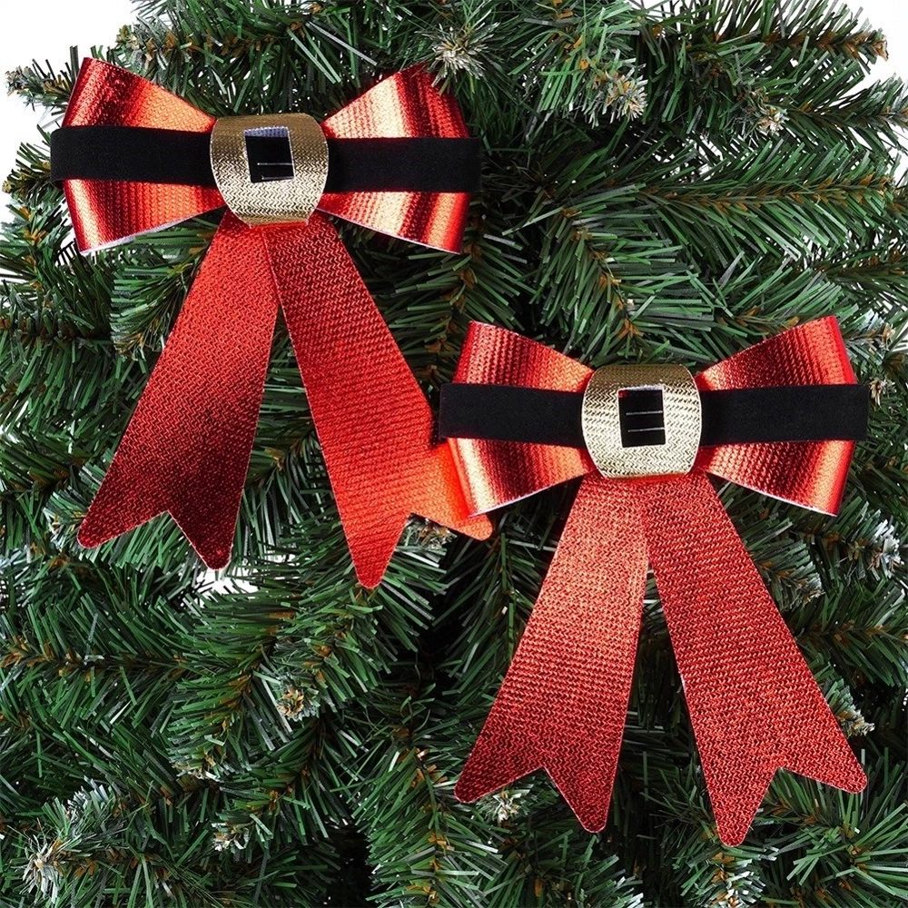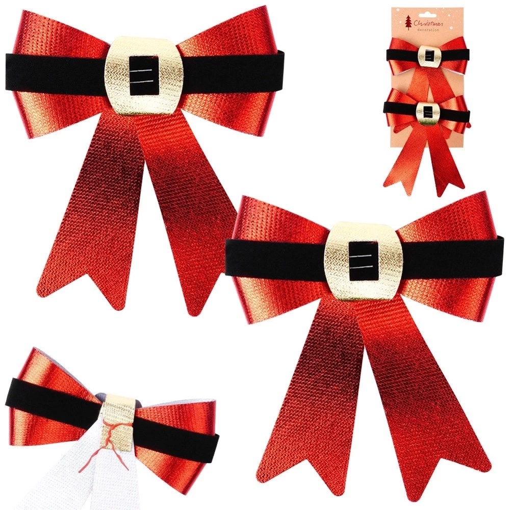 - Efektowny wygląd - Kokardy wykonane z tworzywa w czerwonym, błyszczącym kolorze. Posiadają ozdobny, czarny pasek wykonany z weluru z imitacją złotej klamry, co dodaje elegancji i nawiązuje do klasycznego, świątecznego stylu.