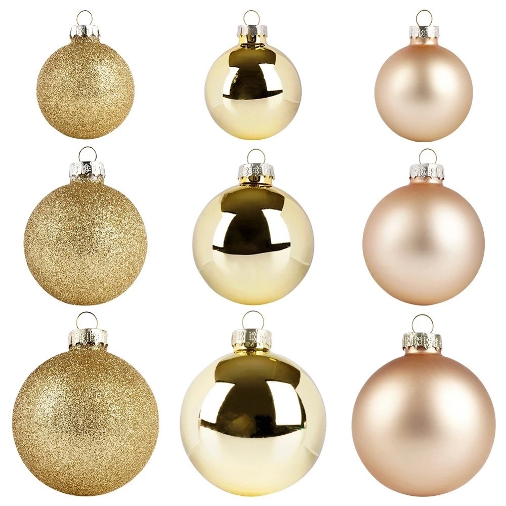 - Zestaw 34 szt. bombek na choinkę - Zestaw 34 bombek w kolorze złotym, które dodadzą blasku każdej choince i stworzą magiczną atmosferę w domu. W zestawie znajdują się bombki o średnicy 4, 5 i 6 cm w kolorze złotym, w wersji błyszczącej i matowej.
