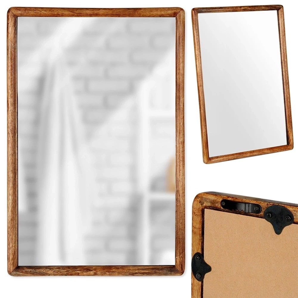 - Eleganckie lustro ścienne w prostokątnym kształcie. Posiada ramę wykonaną z drewna mangowca. Można je zawiesić w pozycji pionowej lub poziomej.