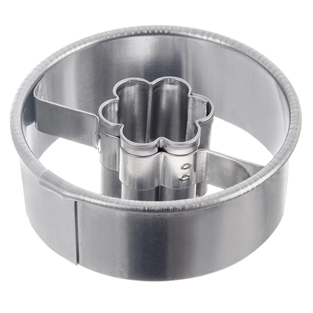 - Wykrawacz cukierniczy w okrągłym kształcie z kwiatem na środku, co umożliwia przygotowanie ciastek z nadzieniem. Wykonany ze stali nierdzewnej.