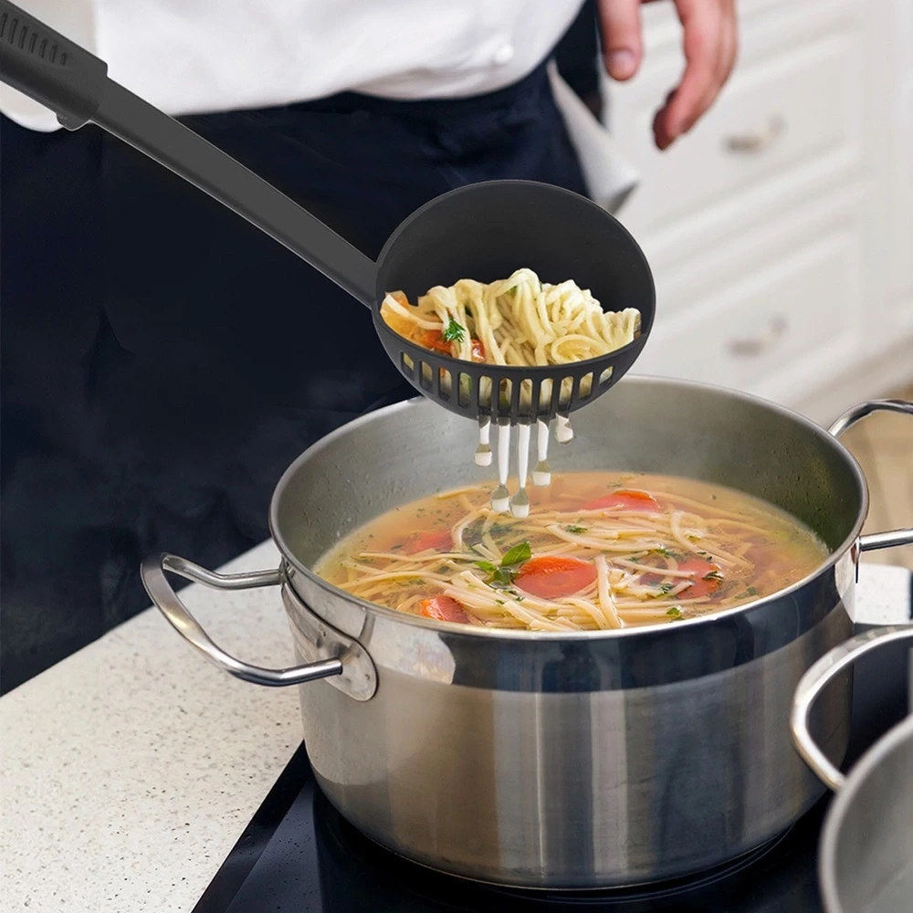 - Chochla kuchenna z krawędzią cedzącą wykonana z termoplastycznego tworzywa. Pomocna przy nalewaniu zup, gulaszów i sosów. Nadaje się do zmywarki.