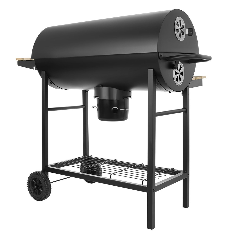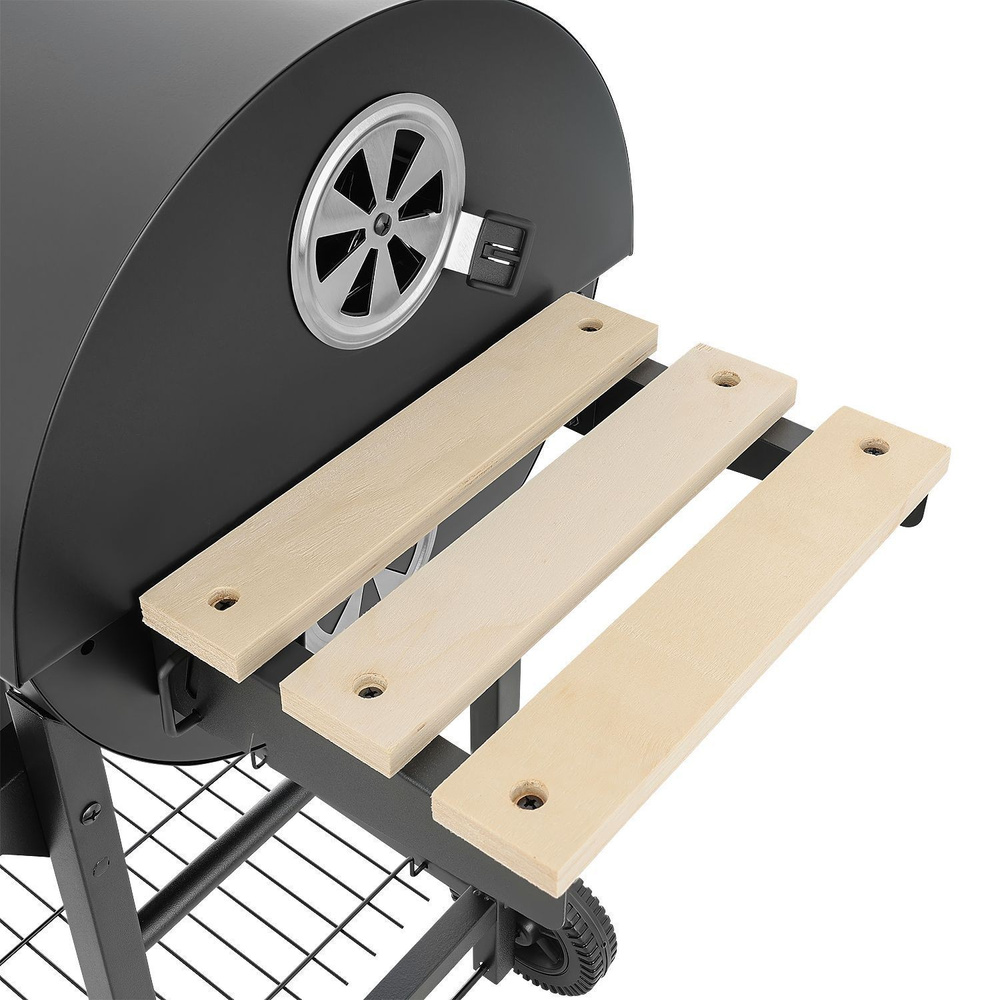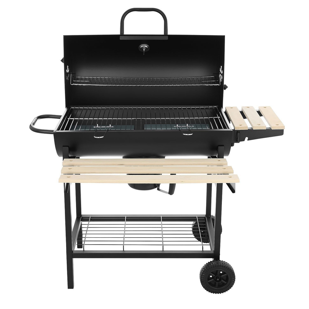 Duży zamykany grill węglowy ogrodowy na kółkach z półkami i paleniskiem