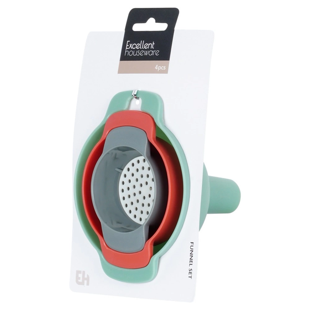 - Zestaw trzech lejków kuchennych w różnych rozmiarach w zestawie z sitkiem. Idealne do napełniania butelek i pojemników. Sprawdzą się w każdej kuchni.