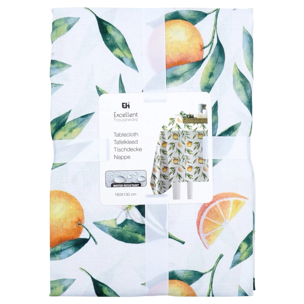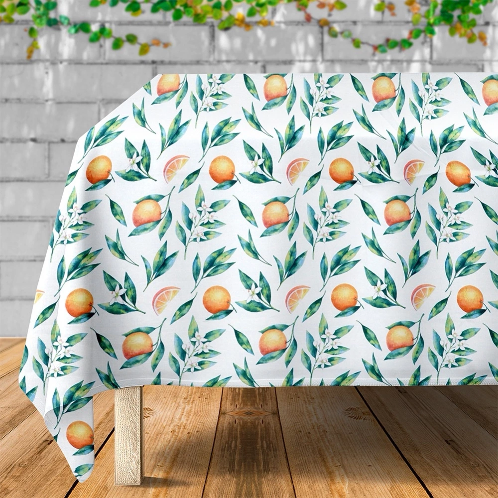 - Trwały i odporny na zabrudzenia - Obrus wykonany z poliestru w kolorze białym z liśćmi i owocami pomarańczy. Praktyczny w codziennym użytkowaniu oraz idealny na specjalne okazje.
