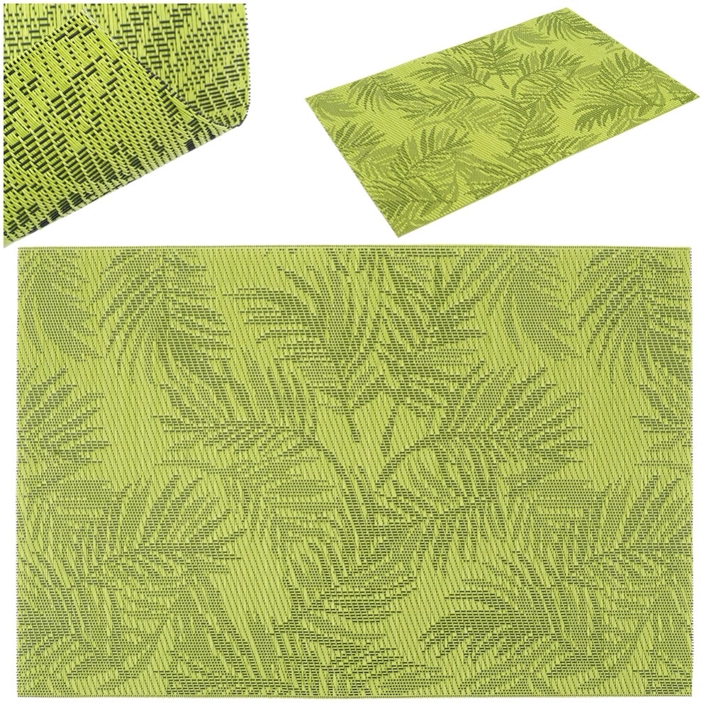 - Prostokątna podkładka kuchenna w zielonym kolorze z motywem liści. Stanowi piękne tło dla zastawy stołowej i sztućców. Podkładka ma wymiary 45x30 cm.