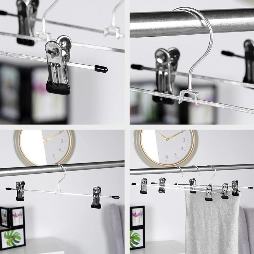 - Idealne do spodni i spódnic - Doskonale sprawdzą się do uporządkowania przestrzeni w szafie. Klipsy na wieszakach pomagają utrzymać spodnie na miejscu, dzięki czemu nie spadną z nich.