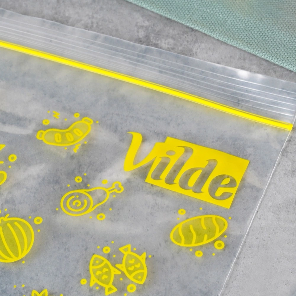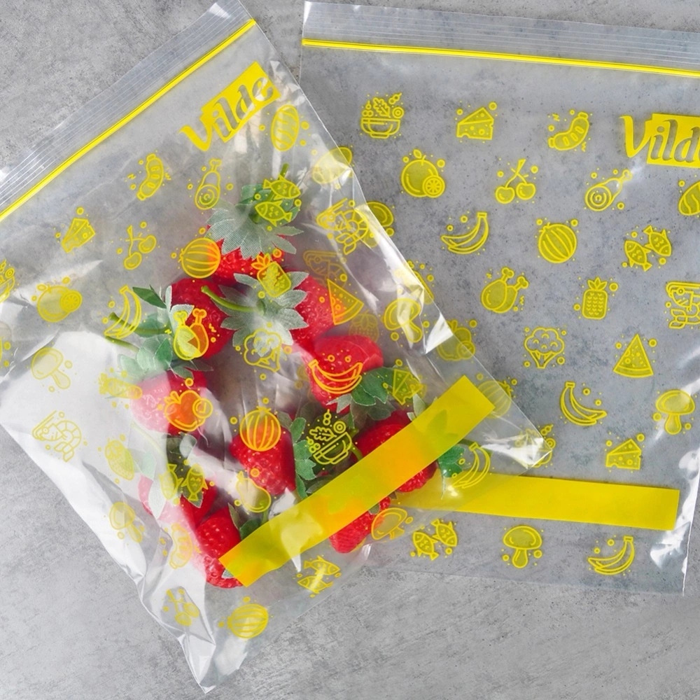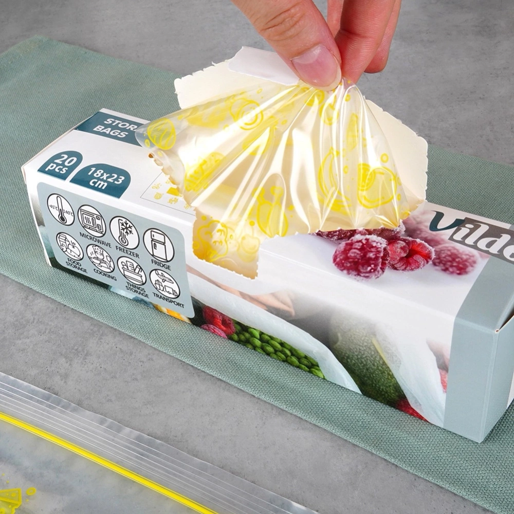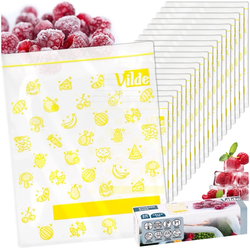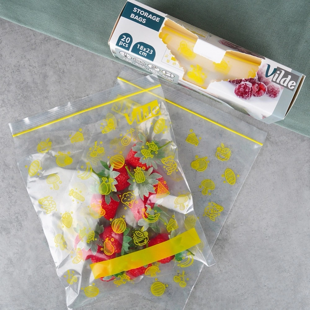- Zestaw 20 szt. woreczków do żywności - Komplet 20 praktycznych woreczków do przechowywania żywności, idealnych do mrożenia, pakowania i organizacji produktów spożywczych. Wykonane z przezroczystego tworzywa z efektownym nadrukiem przedstawiającym motyw żywności. Worki mają wymiary 18 x 23 cm.