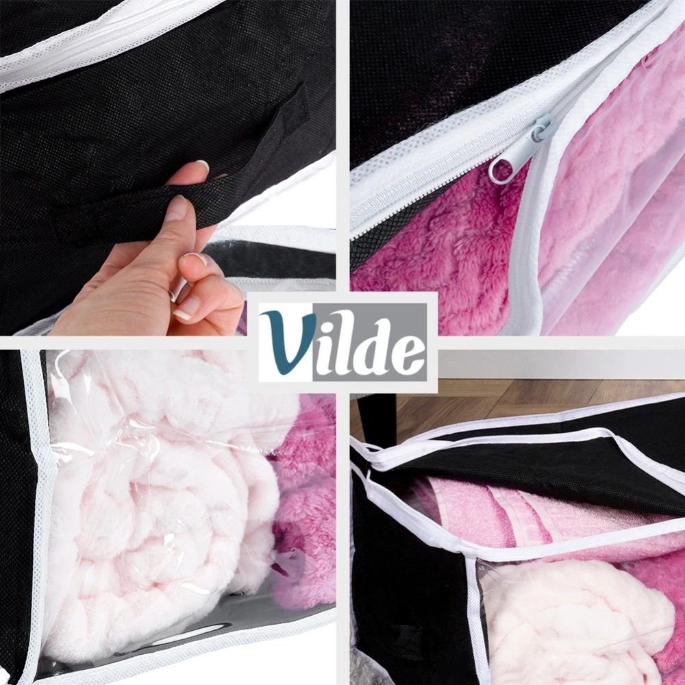Przydatny pokrowiec na pościel. Wykonany z wytrzymałych materiałów. Sprawdzi się do przechowywania koców, poduszek, ale również ubrań i innych tekstyliów. Pokrowiec jest zamykany, więc ochroni przechowywane rzeczy przed zawilgoceniem oraz molami. Z jego pomocą możemy odpowiednio wygospodarować przestrzeń w szafie lub pod łóżkiem. Oryginalny produkt marki Vilde. Wyprodukowano zgodnie z europejskimi standardami.