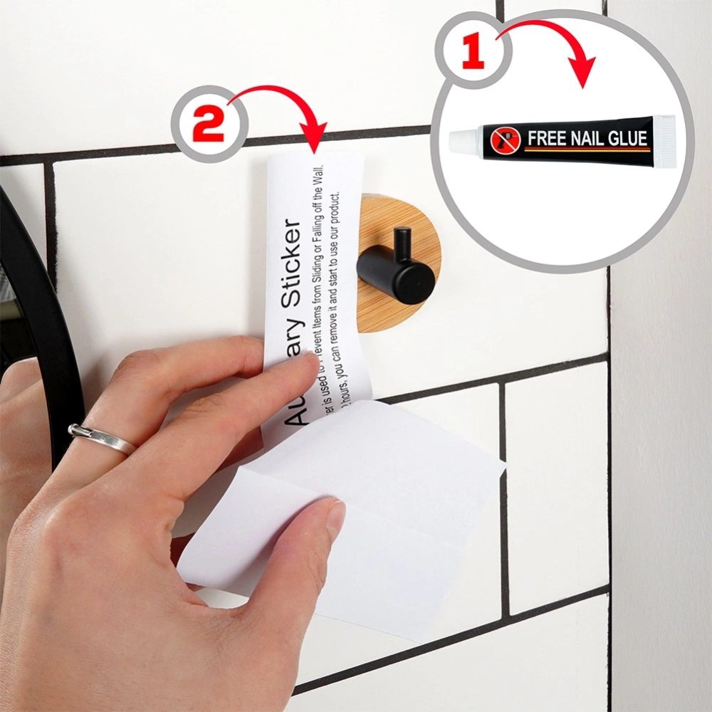 - Łatwy montaż bez wiercenia - Wieszak montowany jest do ściany za pomocą kleju, bez potrzeby użycia narzędzi czy wiercenia. W zestawie znajdują się specjalne naklejki, które należy przymocować na haczyku i ścianie, a następnie pozostawić na 72 godziny przed pierwszym użyciem, aby zapewnić mocne i trwałe przyleganie. Przed montażem należy dokładnie oczyścić i odtłuścić miejsce, w którym chcemy powiesić haczyk.