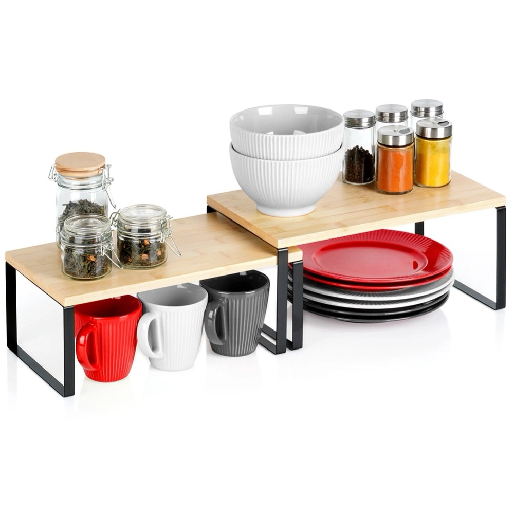 - Komplet dwóch półek kuchennych pozwoli na lepszą organizację przestrzeni w kuchni. Półki można swobodnie aranżować, ustawiając je piętrowo, obok siebie, w kształcie litery "L" lub wsuwając jedną pod drugą.