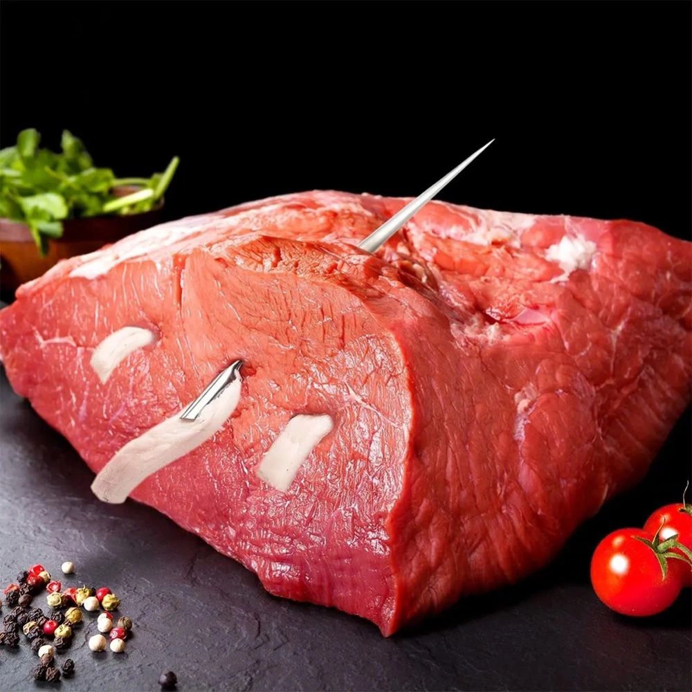 - Łatwe szpikowanie mięsa - Specjalna konstrukcja z haczykiem i ząbkami umożliwia stabilne mocowanie składników, a następnie ich precyzyjne umieszczenie wewnątrz mięsa wzdłuż włókien.