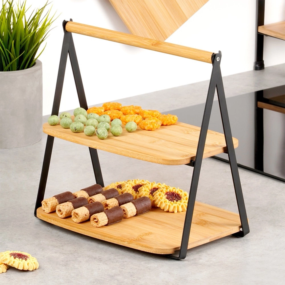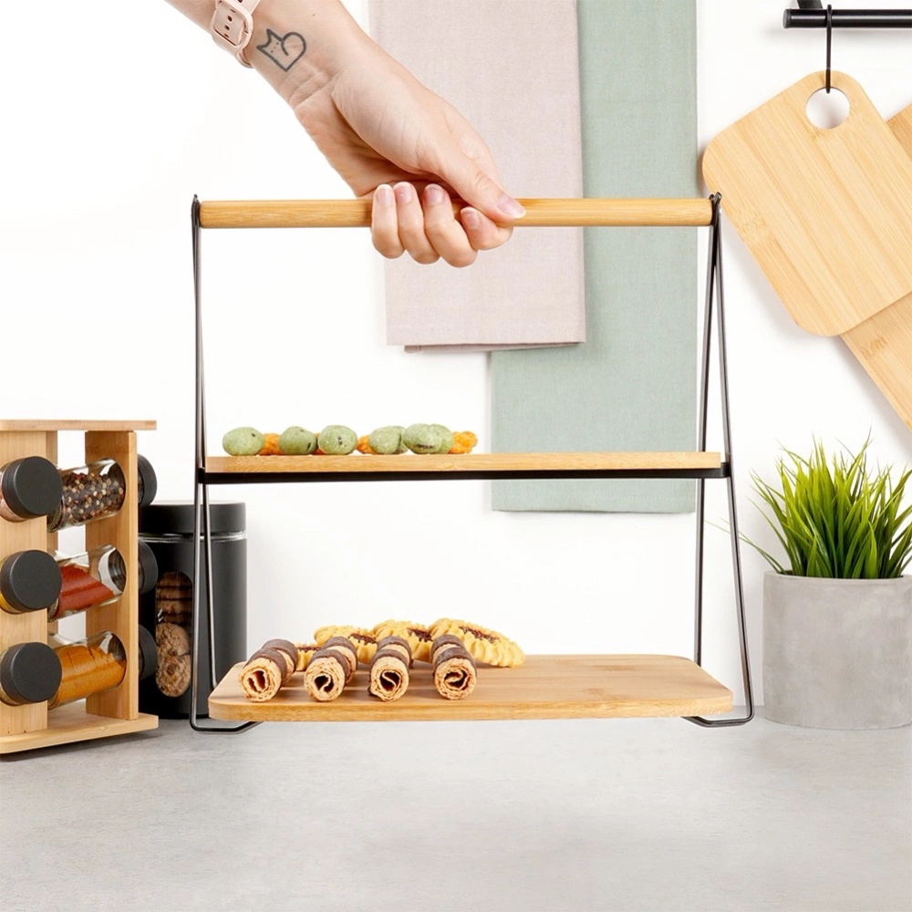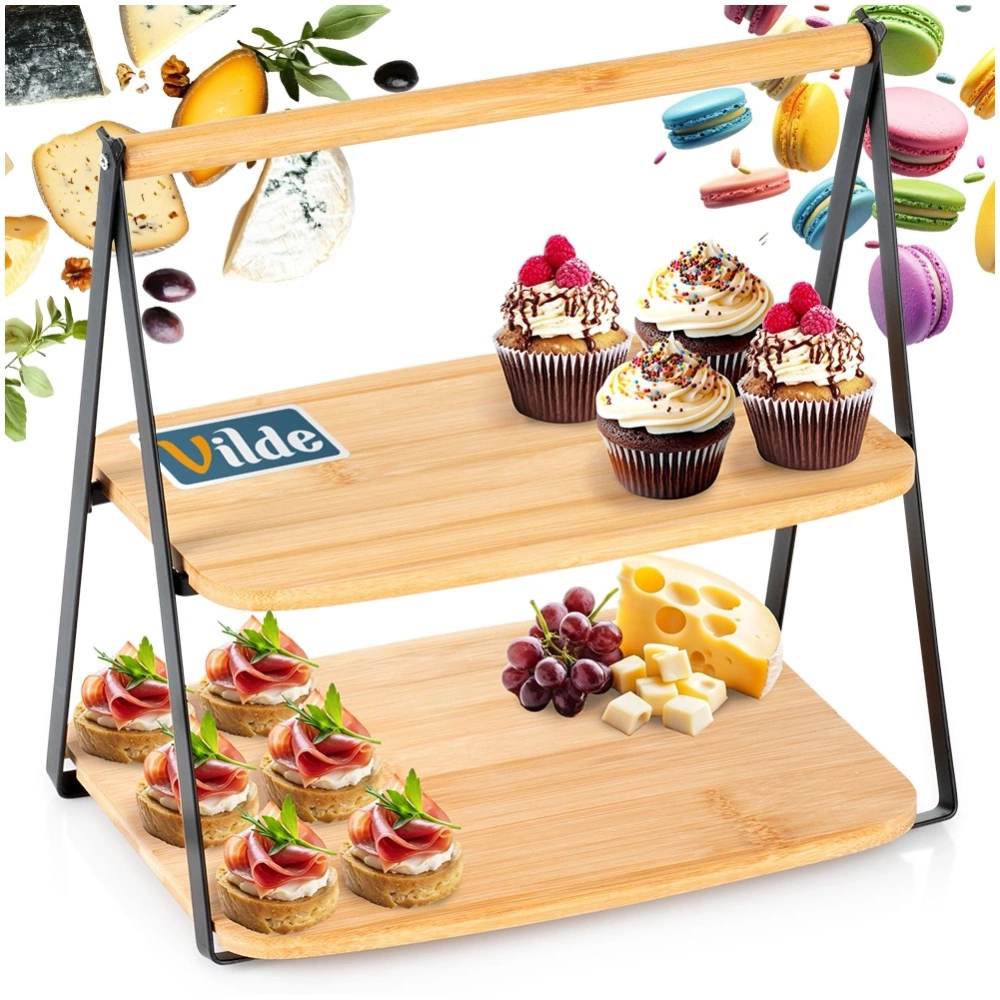 - Piętrowa patera na wędlinę, sery, ciastka, owoce, przystawki, przekąski. Posiada 2 poziomy składające się z tac wykonanych z drewna bambusowego.