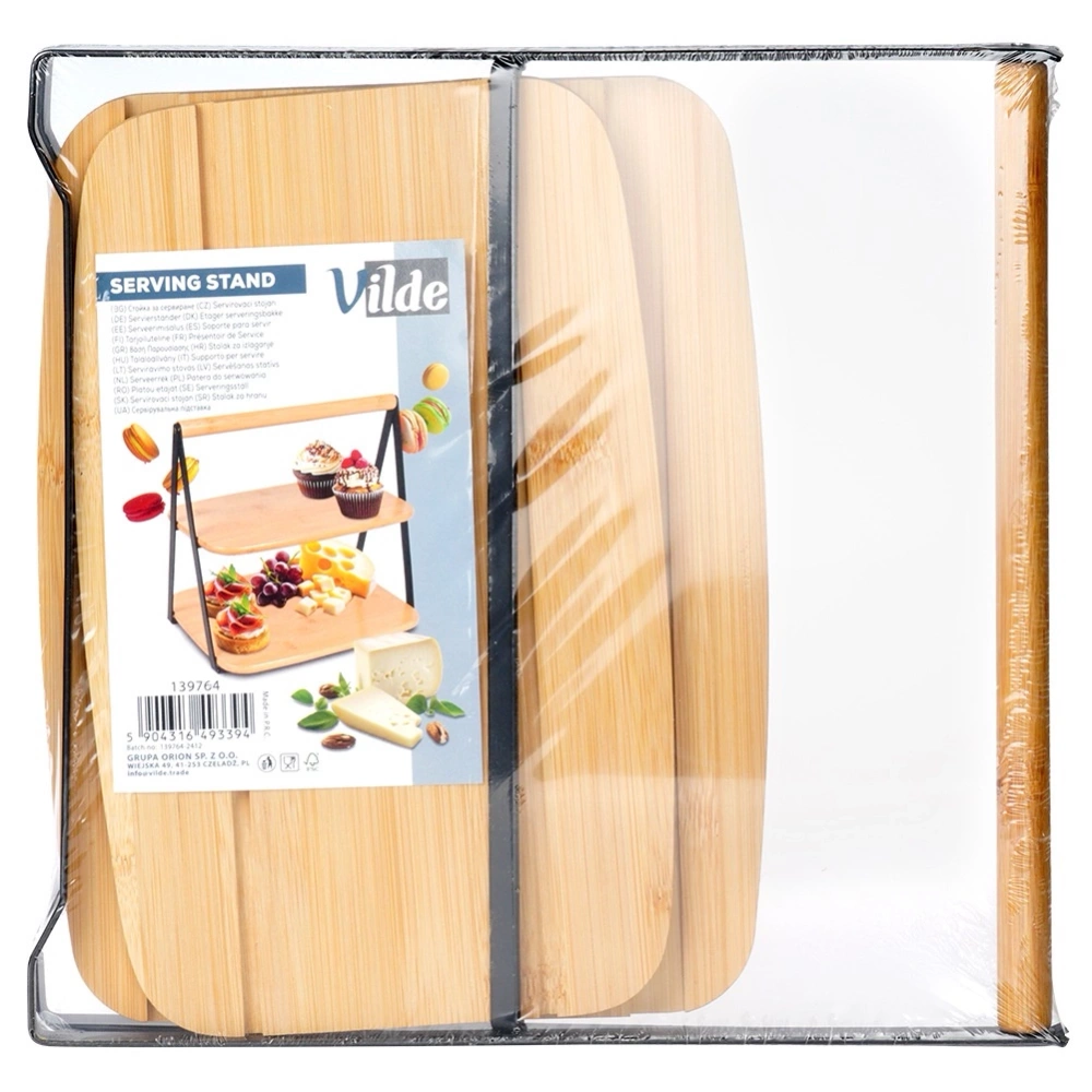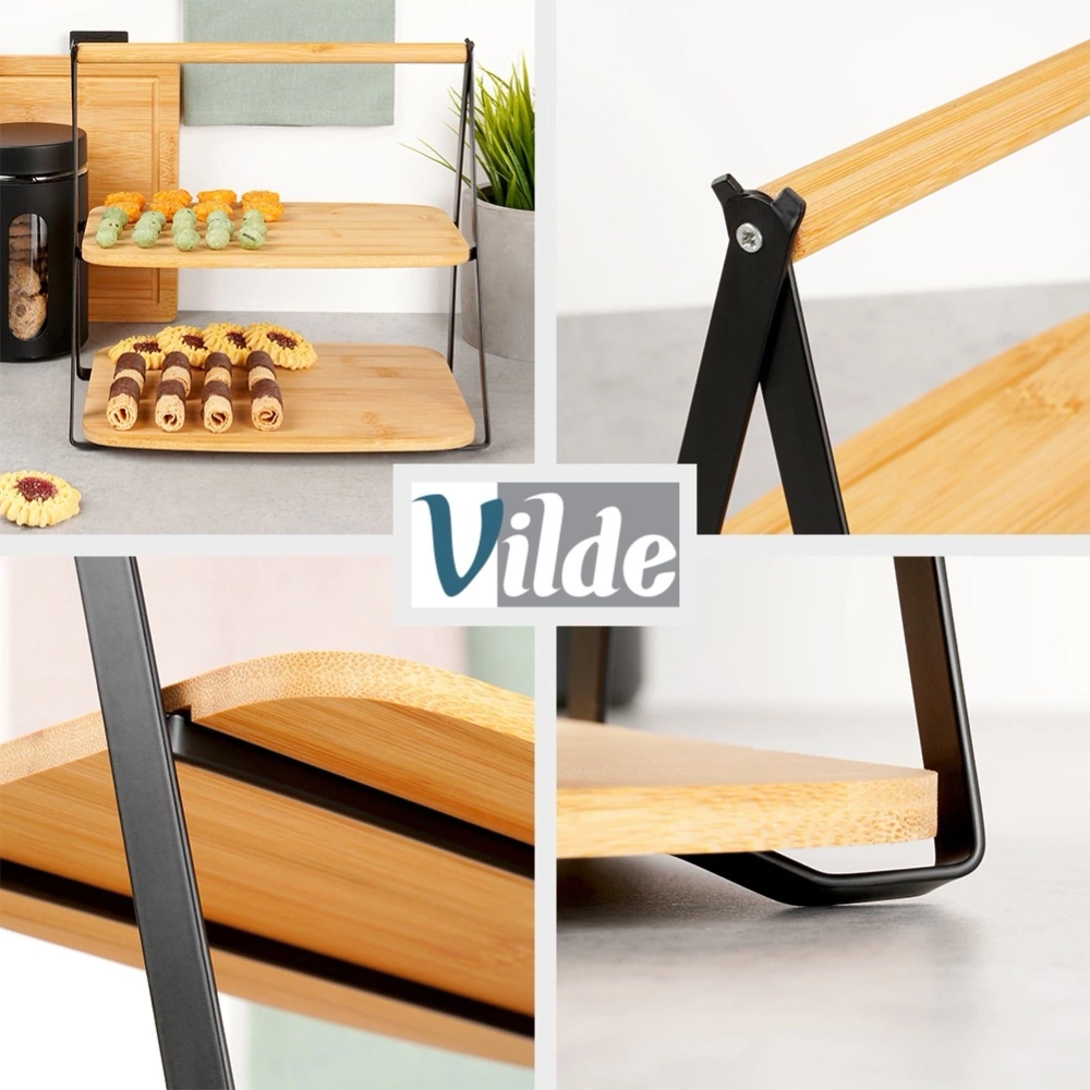Dwupiętrowa patera świetnie prezentują się na niej babeczki, ciasteczka, różnego rodzaju desery, jak również przystawki. Możemy wykorzystać ją do serwowania w efektowny sposób desek serów, wędlin oraz mięs. Idealnie sprawdzi się do przygotowania słodkich stołów, dzięki niej wyeksponujemy na stole słodkości oraz słone przekąski. Oryginalny produkt marki Vilde. Wyprodukowano zgodnie z europejskimi standardami.