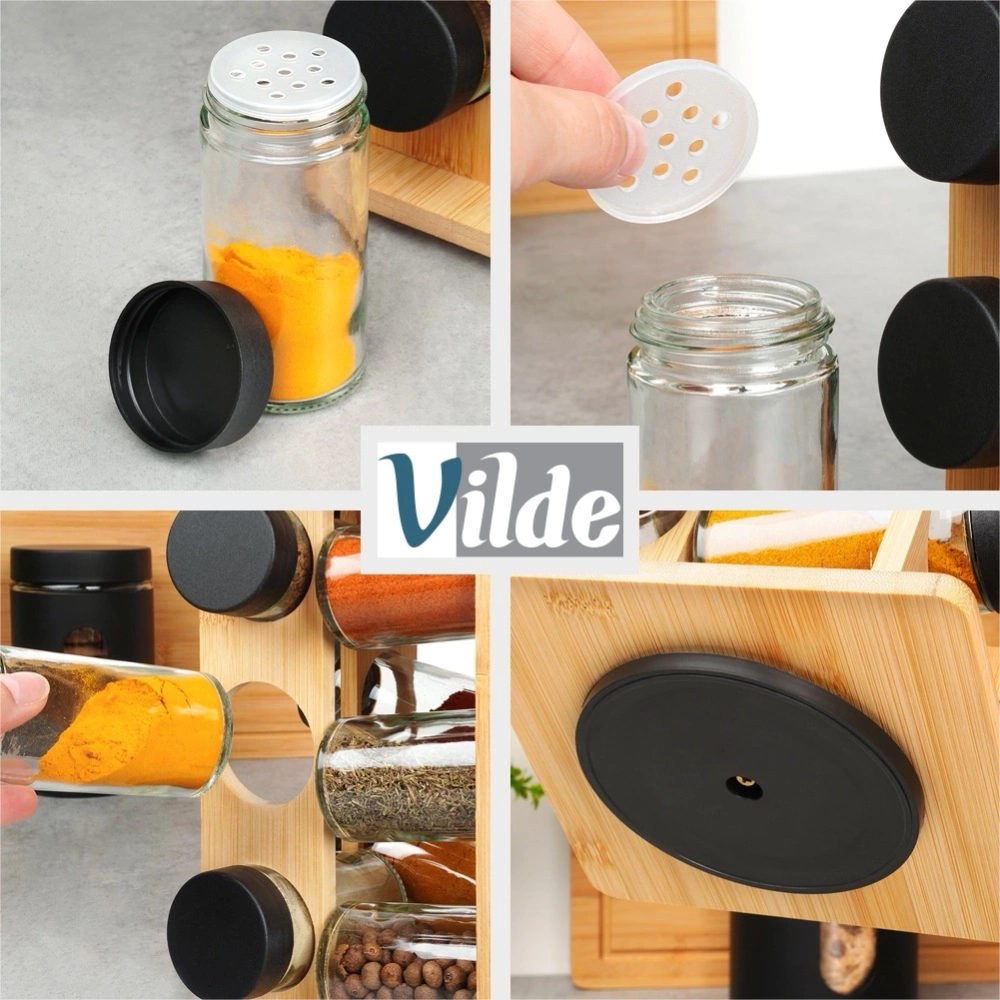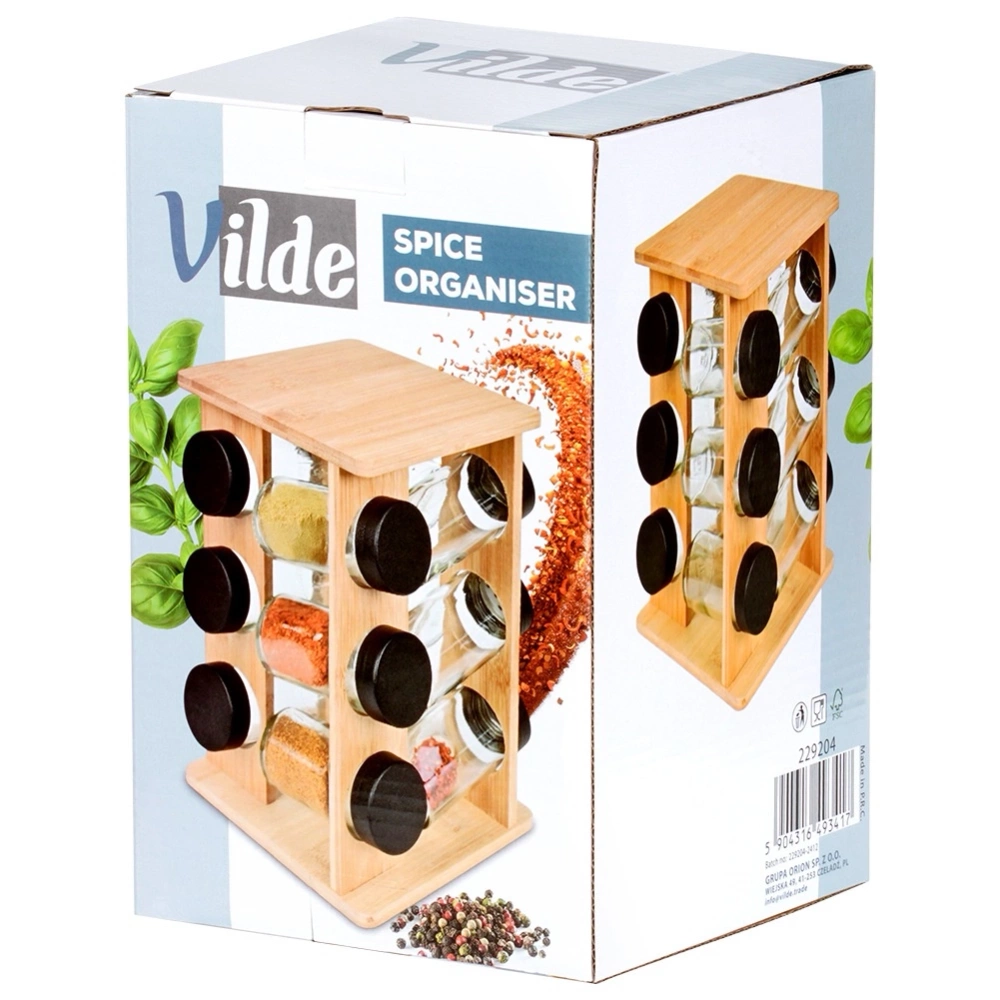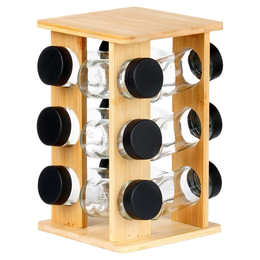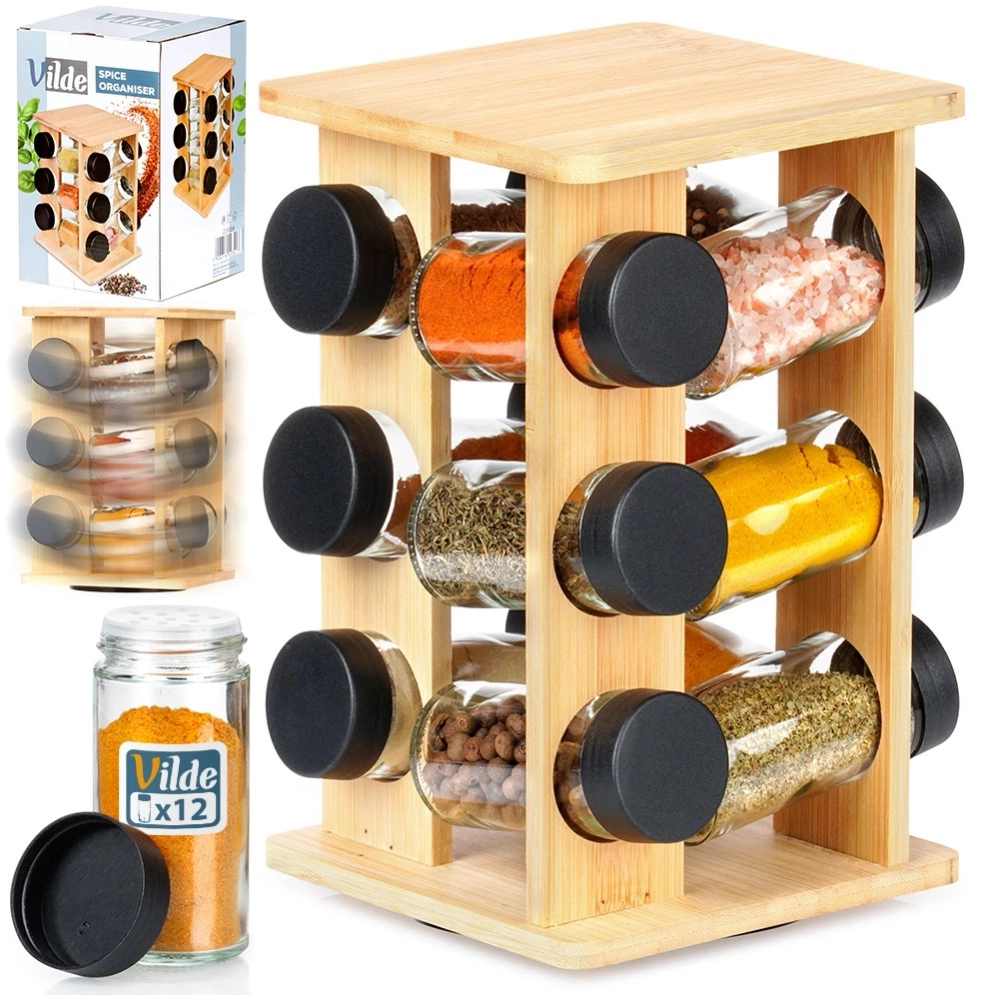 - Stojak obrotowy na przyprawy wraz z 12 pojemnikami, które umożliwią przechowywanie ulubionych przypraw. Stojak wykonany z drewna, a pojemniki są szklane.