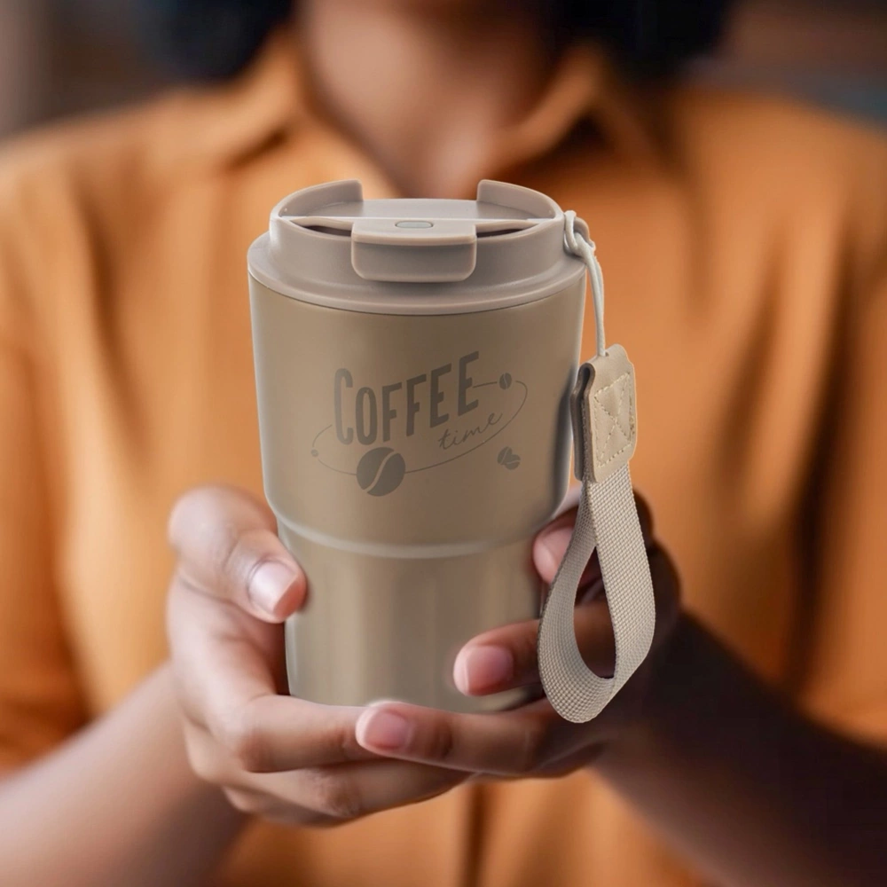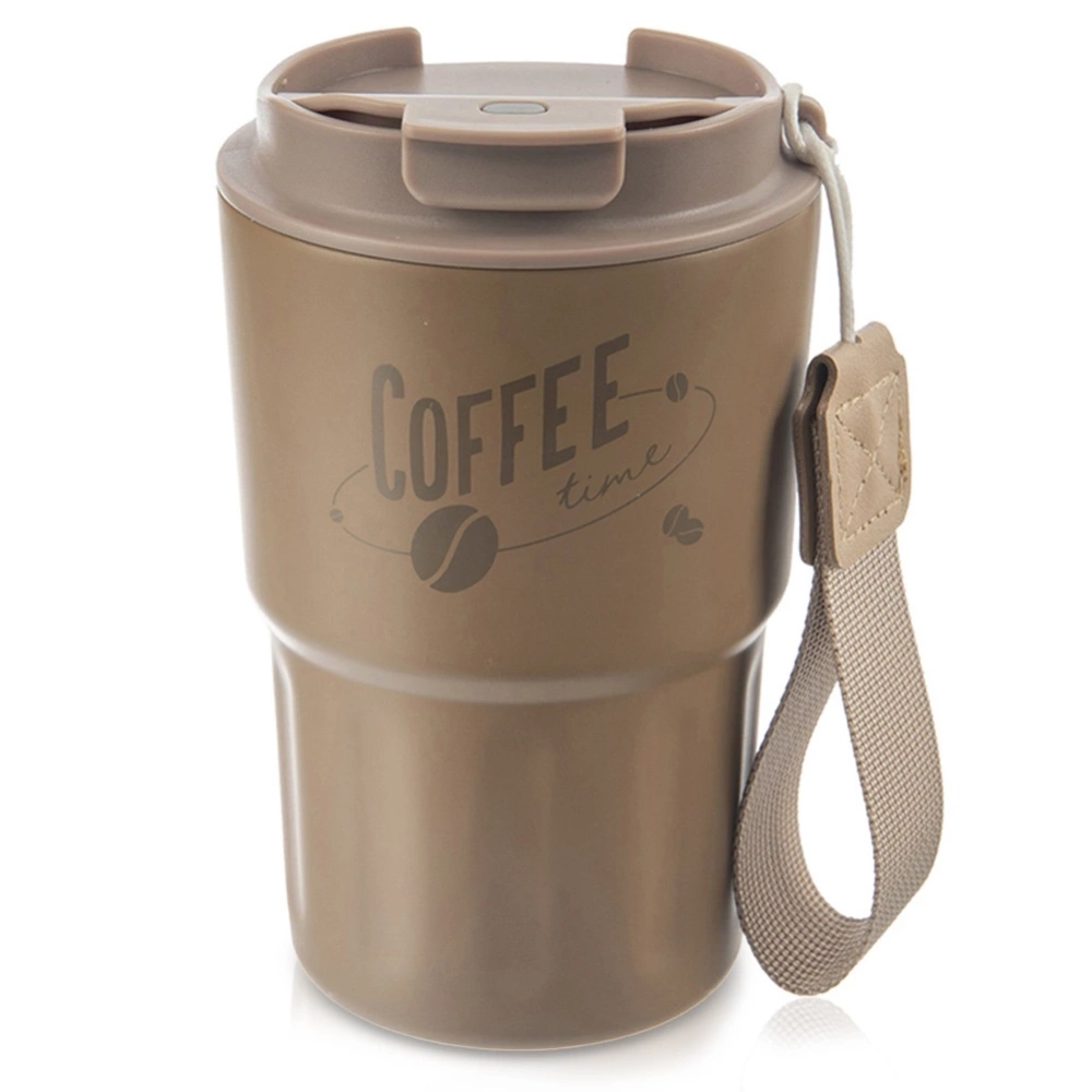 - Wykonany ze stali nierdzewnej - Wykonany ze stali nierdzewnej w brązowym kolorze z napisem "Coffee Time". Pokrywka i ustnik wykonane z tworzywa.